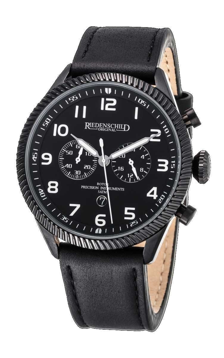 Dieser Chronograph von Riedenschild mit geriffelter Lünette im Turbinen Design ist mit einem Quarzuhrwerk von Miyota ausgestattet. Das Modell verfügt über ein Gehäuse aus Edelstahl und eine Datumsanzeige bei 6 Uhr, hat eine hochwertige IP Beschichtung in schwarz. Die Uhr ist teilweise poliert und teils gebürstet. Zudem ist der Chronograph auf bis zu 5 ATM Wasserdicht und besitzt eine Stoppfunktion. Ein gehärtetes Mineralglas umgibt das Zifferblatt mit weißen Zeigern und Indizes. Das schwarze Lederarmband rundet den klassischen Look perfekt ab.