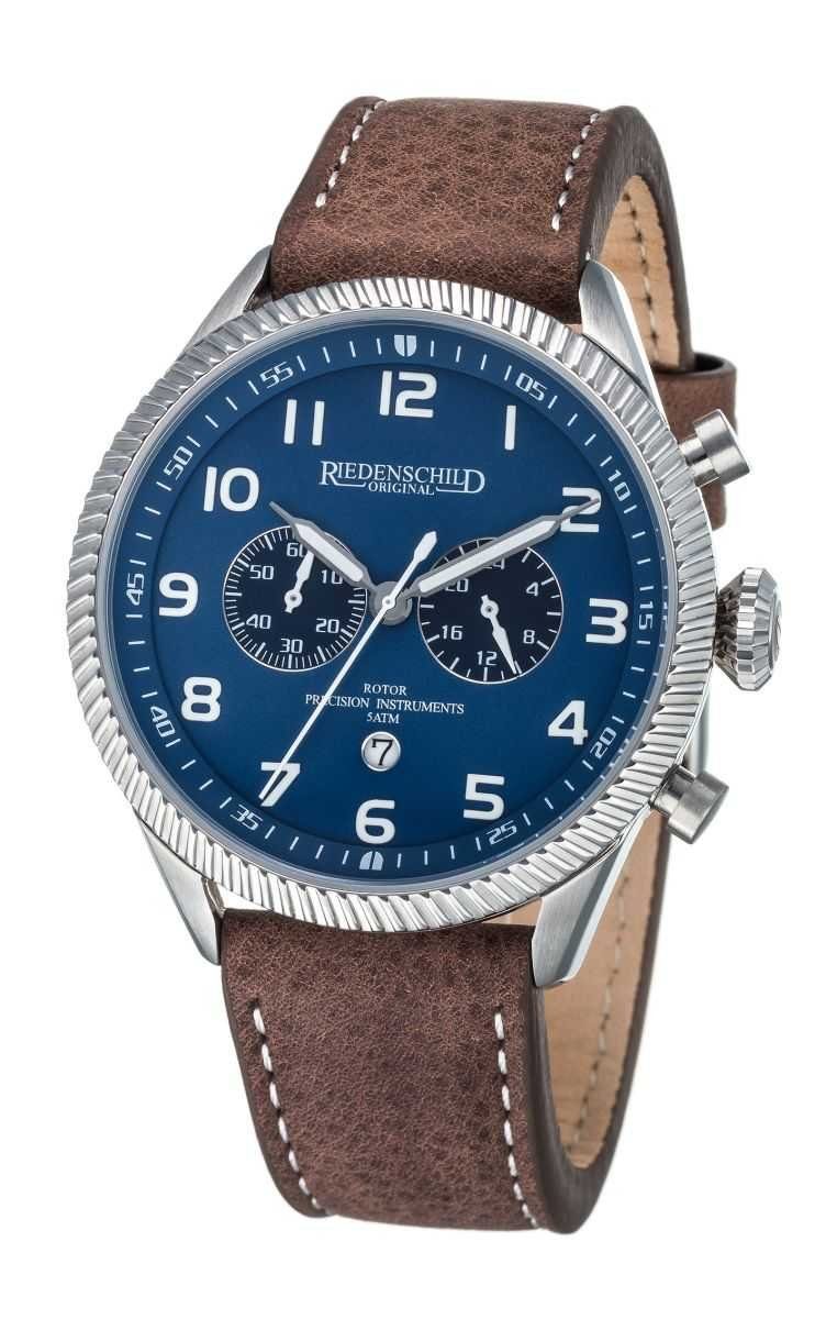 Dieser Chronograph von Riedenschild mit geriffelter Lünette im Turbinen Design ist mit einem Quarzuhrwerk von Miyota ausgestattet. Das Modell verfügt über ein Gehäuse aus Edelstahl und eine Datumsanzeige bei 6 Uhr. Die Uhr ist teilweise poliert und teils gebürstet. Zudem ist der Chronograph auf bis zu 5 ATM Wasserdicht und besitzt eine Stoppfunktion. Ein gehärtetes Mineralglas umgibt das Zifferblatt mit silberfarbenen Zeigern und weissen Indizes. Das aufgeraute braune Lederarmband rundet den klassischen Look perfekt ab.