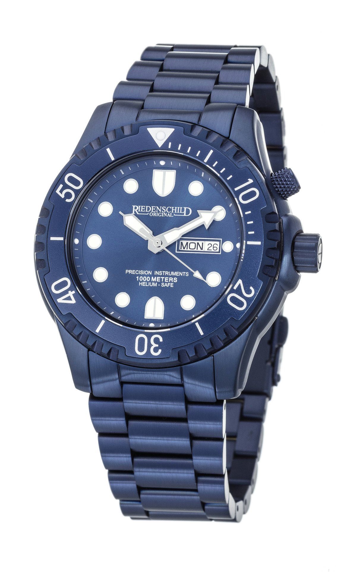 Herren Taucheruhr von Riedenschild mit makelloser Verarbeitung. Das Gehäuse ist aus rostfreiem und salzwasserbeständigen 304 Edelstahl gefertigt, die Lünette ist einseitig drehbar. Die Indizes und Zeiger sind mit einer stark fluoreszierenden Masse bestückt. Das detailreiche Zifferblatt im sogenannten Sonnenschliff verleiht eine besondere Tiefenwirkung. Das Modell wird von einer leistungsstarken Batterie mit einer Lebensdauer von bis zu 10 Jahren angetrieben. Im Inneren der Uhr arbeitet ein präzises Quarzuhrwerk aus dem Hause Citizen Miyota, Kaliber 2S60. Das Saphirglas ist kratzfest und Entspiegelt, damit haben Sie die Zeit immer im Blick. Dieses Modell ist perfekt für Hobby- und Berufstaucher und hat eine Wasserdichtigkeit von 100 ATM (nach Din 8310 / ISO 2281). Die Uhr ist mit einem hautfreundlichen und strapazierfähigen Silikonarmband sowie einem massivem rostfreiem und salzwasserbeständigen Edelstahlarmband ausgestattet. Die enthaltenen Uhrenarmbänder sind mit Schnellwechsel-Federstegen ausgestattet (Quick Release System). Das Metallarmband besitzt eine ausklappbare Erweiterung, so kann die Uhr auch mit einem Neoprenanzug getragen werden. Bekannt wurden die Taucheruhren unter dem Namen ‘‘Army Watch‘‘ welche seit 2002 durch die Firma Richard Eichmüller (in München/Deutschland) designed und produziert werden. Das Design ist seit jeher ein wichtiger Grundpfeiler und wird daher ausschließlich in München ausgearbeitet. Die Produktion der Uhren findet unter den neuesten technischen Voraussetzungen statt und wird kontinuierlich durch Produktionsexperten von Riedenschild vor Ort überprüft und kontrolliert.