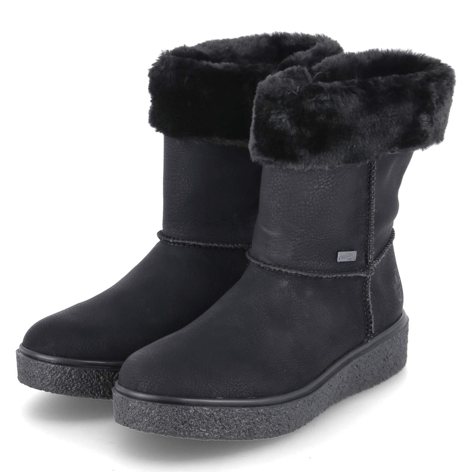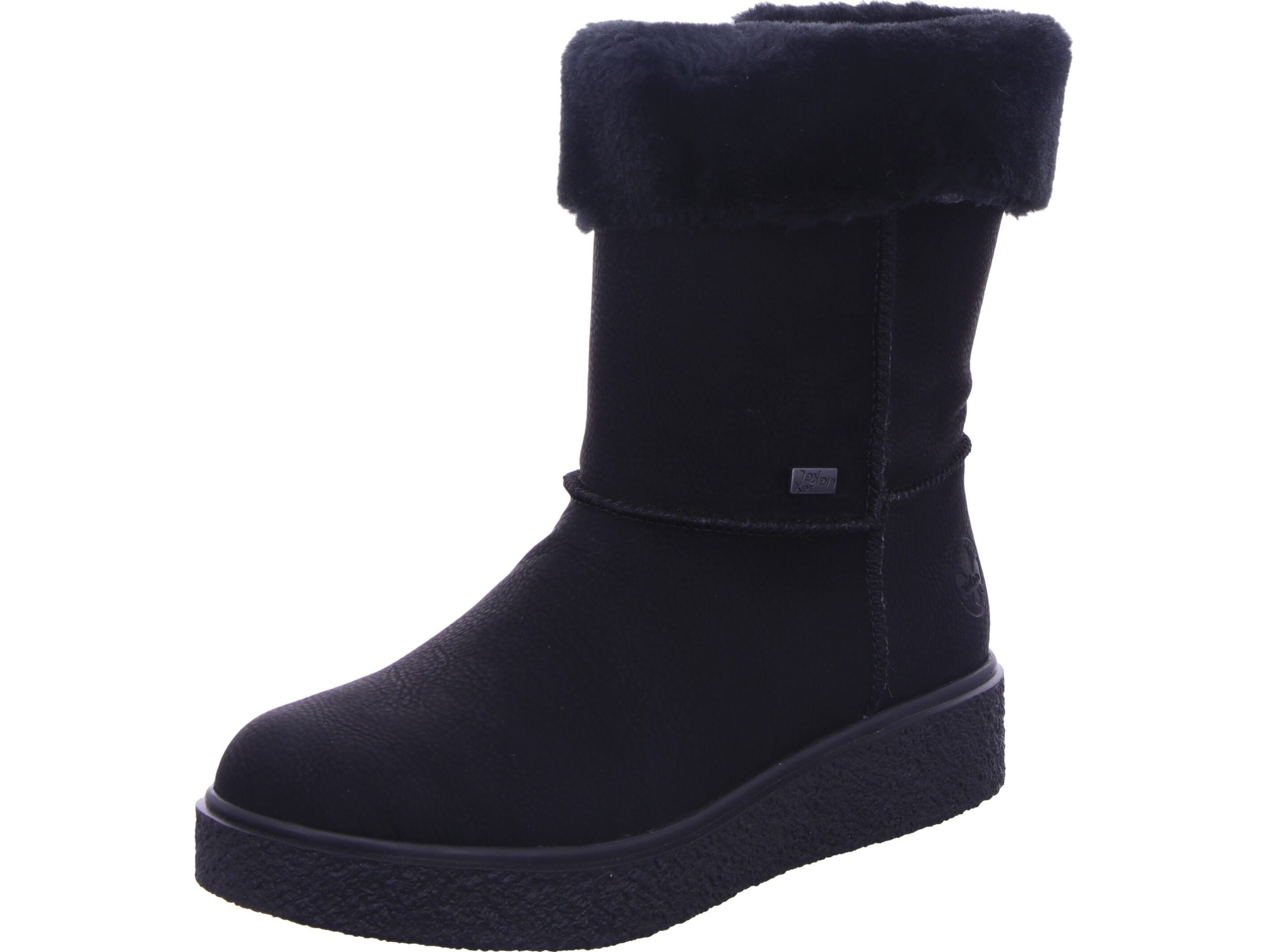 Die schwarzen Rieker Damen Winterstiefeletten aus Kunstleder kombinieren Funktionalität mit einem natürlichen Look. Sie sind wasserfest und atmungsaktiv, ideal für kalte und nasse Tage. Der Umschlagkragen mit Kunstfell verleiht den Stiefeletten eine gemütliche Optik, während der seitliche Reißverschluss das Anziehen erleichtert. Grobe Ziernähte setzen stilvolle Akzente. Innen sorgt ein warmes Textilfutter für wohlige Wärme, und das gepolsterte Wechselfußbett bietet zusätzlichen Komfort. Die flexible, rutschhemmende Cupsohle mit Waffelprofil sorgt für sicheren Halt auf verschiedenen Untergründen und rundet das Design dieser praktischen Winterstiefeletten ab.