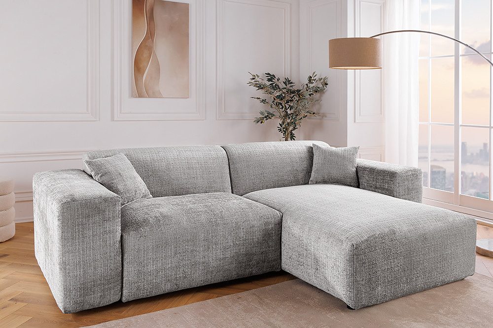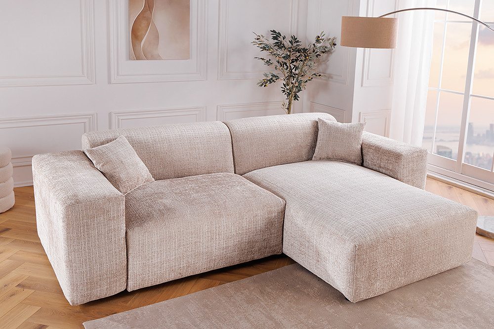 Mit dem Ecksofa SIGNATUR holst Du Dir ein elegantes und gemütliches Highlight in Dein Wohnzimmer. Der weiche Chenille-Stoff in Beige sorgt für eine angenehme Haptik und verleiht dem Sofa eine moderne, einladende Ausstrahlung. Dank der langlebigen Nosagfederung in der Sitzfläche und der Polsterung aus hochwertigem Schaumstoff bietet das Sofa einen erstklassigen Sitzkomfort. Ein besonderes Plus: Das Sofa ist beidseitig aufbaubar, sodass Du es flexibel an Deine Raumgestaltung anpassen kannst.
