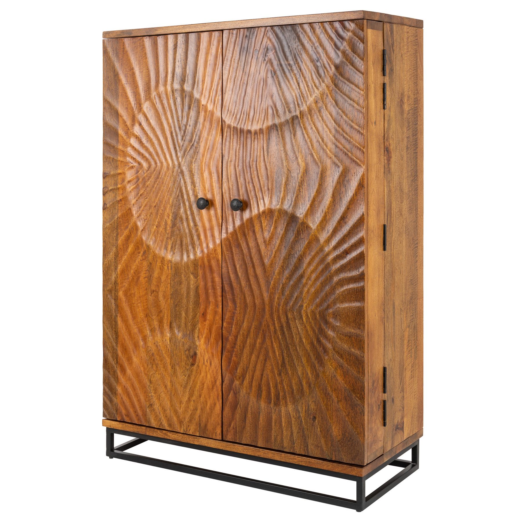 Dieser Barschrank ist wirklich etwas Besonderes, denn sein außergewöhnliches Design zieht alle Blicke sofort auf sich. Auf einem schlichten Metallgestell ruht ein massiver Korpus aus Mangoholz, welches mit tollen Farbverläufen und spannender Maserung begeistert. Das Highlight des Highboards ist jedoch ohne Frage die aufwändige 3D-Schnitzerei, die auf der Front angebracht ist. Die organischen Formen scheinen über die Oberfläche zu fließen und begeistern mit außergewöhnlicher Optik und Haptik.