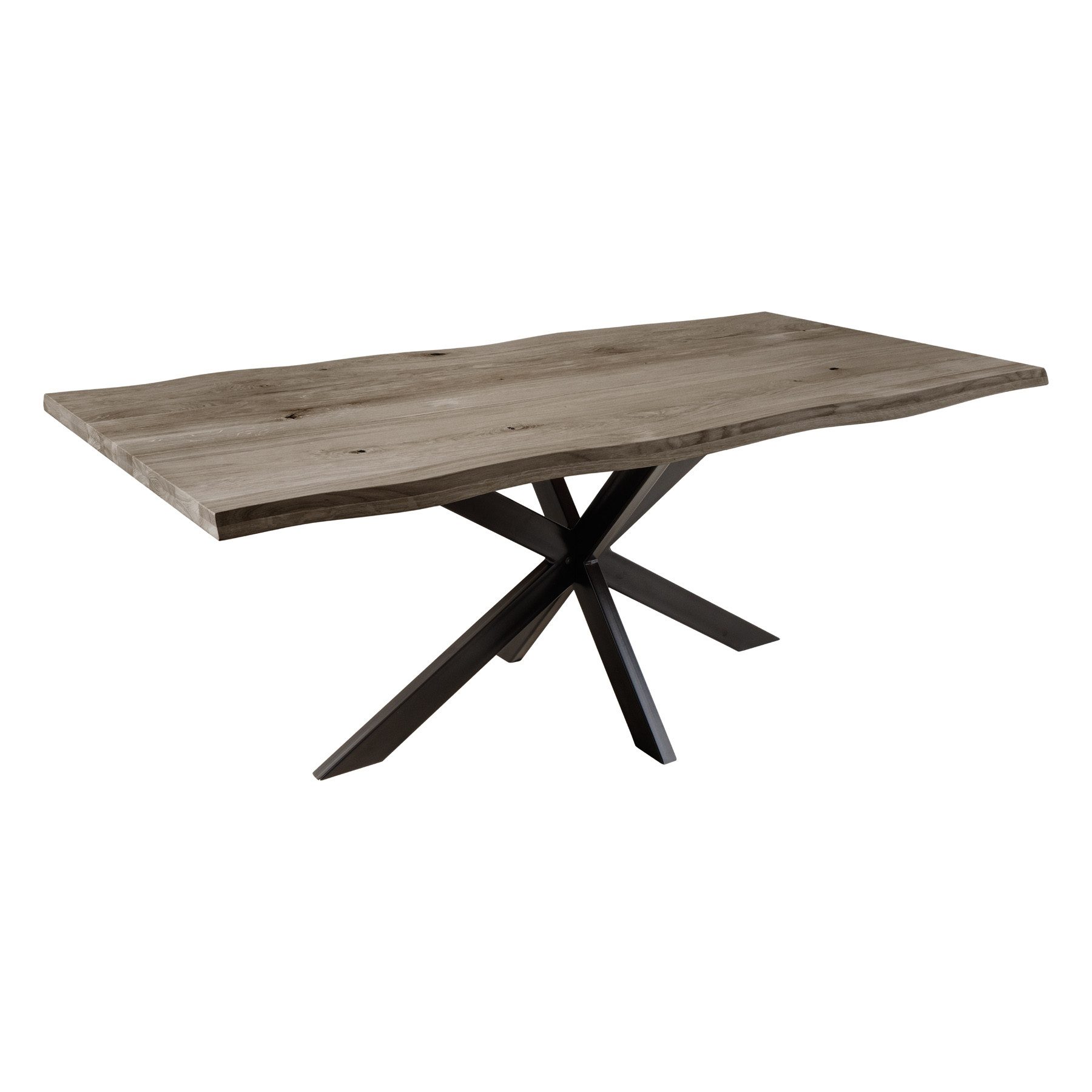 Die beeindruckende Holzplatte ruht auf einem stabilen, schwarzen Sterngestell aus pulverbeschichtetem Metall. Das moderne Design des Gestells setzt einen eleganten Kontrapunkt zum warmen Eichenholz und sorgt gleichzeitig für sicheren Halt. Durch das zeitlose Design lässt sich der Tisch mühelos mit verschiedenen Stilen kombinieren – sei es mit unterschiedlichen Stühlen, stilvollen Lampen oder passenden Sideboards.