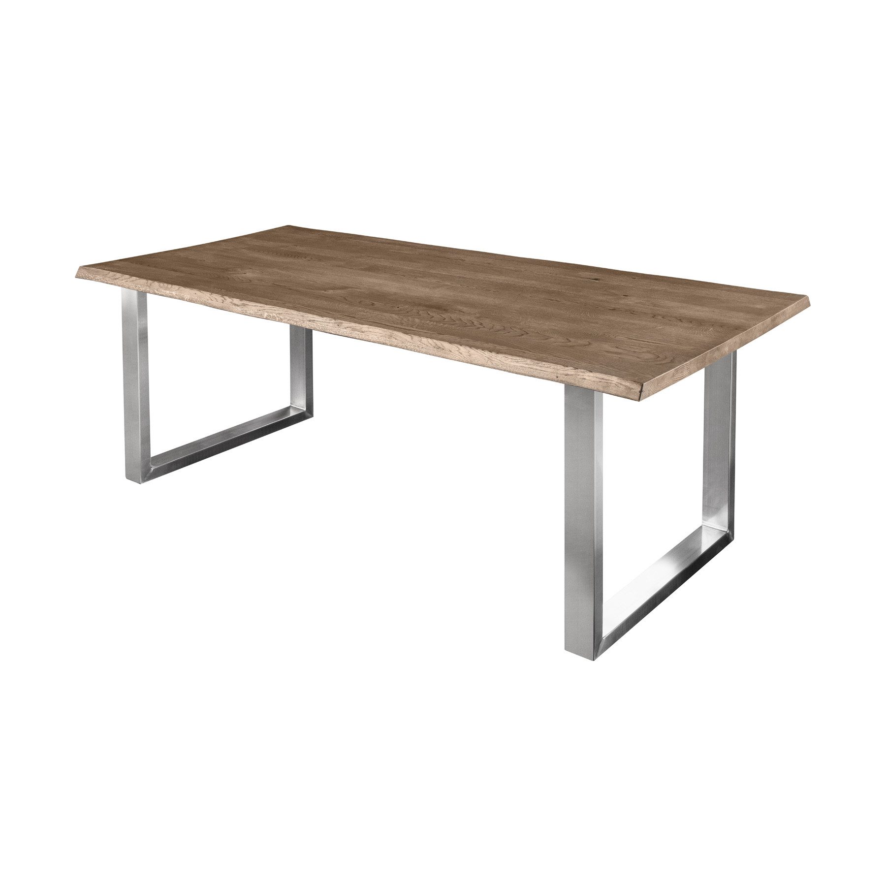 Der Esstisch WILD OAK vereint kraftvolle Natur mit urbanem Stil und wird zum Mittelpunkt jeder Wohnküche oder jedes Esszimmers. Die massive Tischplatte aus Wildeiche mit natürlicher Baumkante bringt die ursprüngliche Schönheit des Holzes zur Geltung – jede Maserung ist ein Unikat. In Kombination mit dem Silber U-Gestell aus Edelstahl entsteht ein spannender Kontrast zwischen warmem Naturmaterial und cooler, moderner Formensprache.