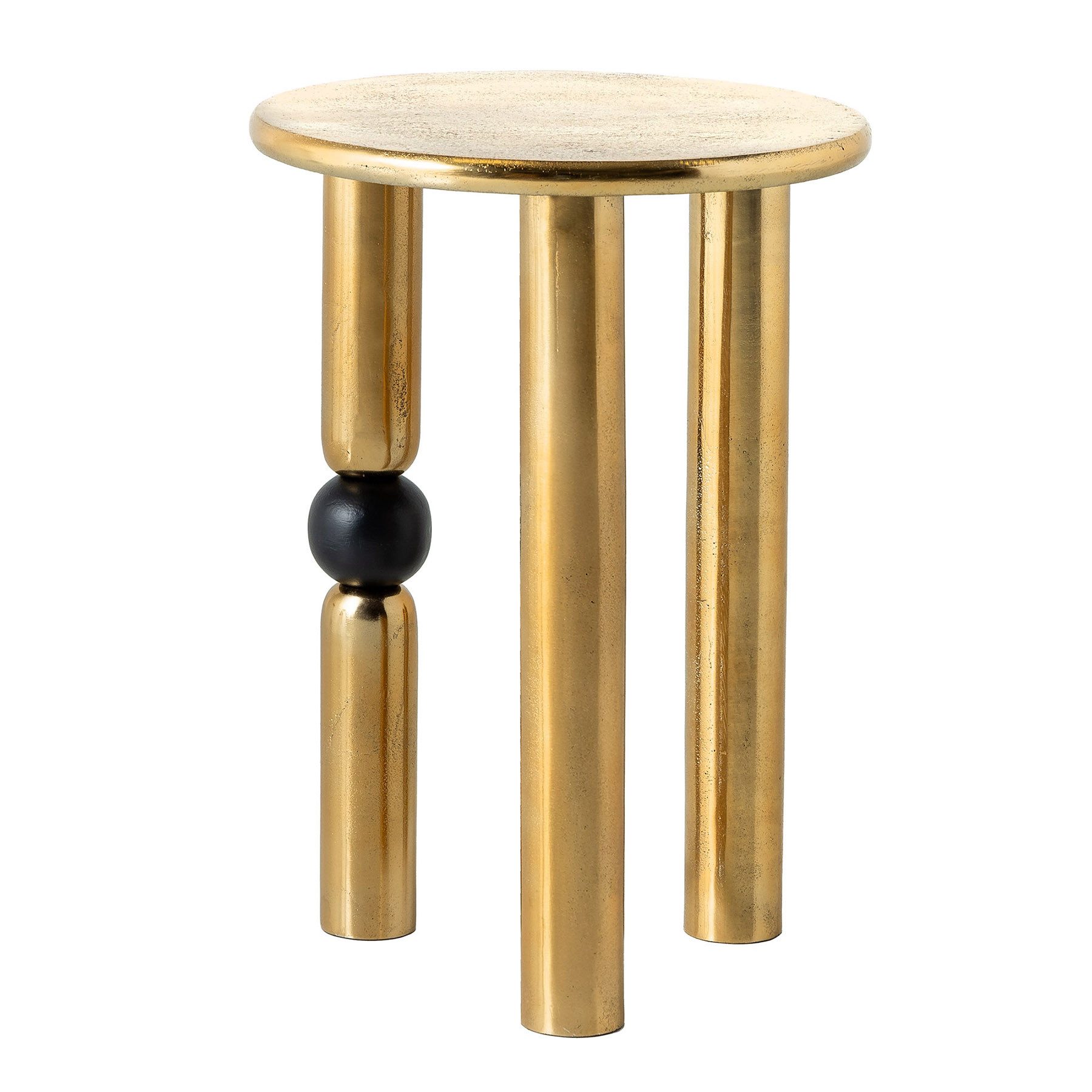 Mit seinem einzigartigen Design zieht dieser Beistelltisch sofort alle Blicke auf sich. Die runde Tischplatte ruht auf drei langen Beinen, von dem ein Bein als Highlight von einer schwarzen Kugel stilvoll unterbrochen wird. Der gesamte Tisch erstrahlt in einem warmen Goldton und ist mit charmanten Lackunregelmäßigkeiten verziert – ein echtes Unikat, das Dein Zuhause bereichert.