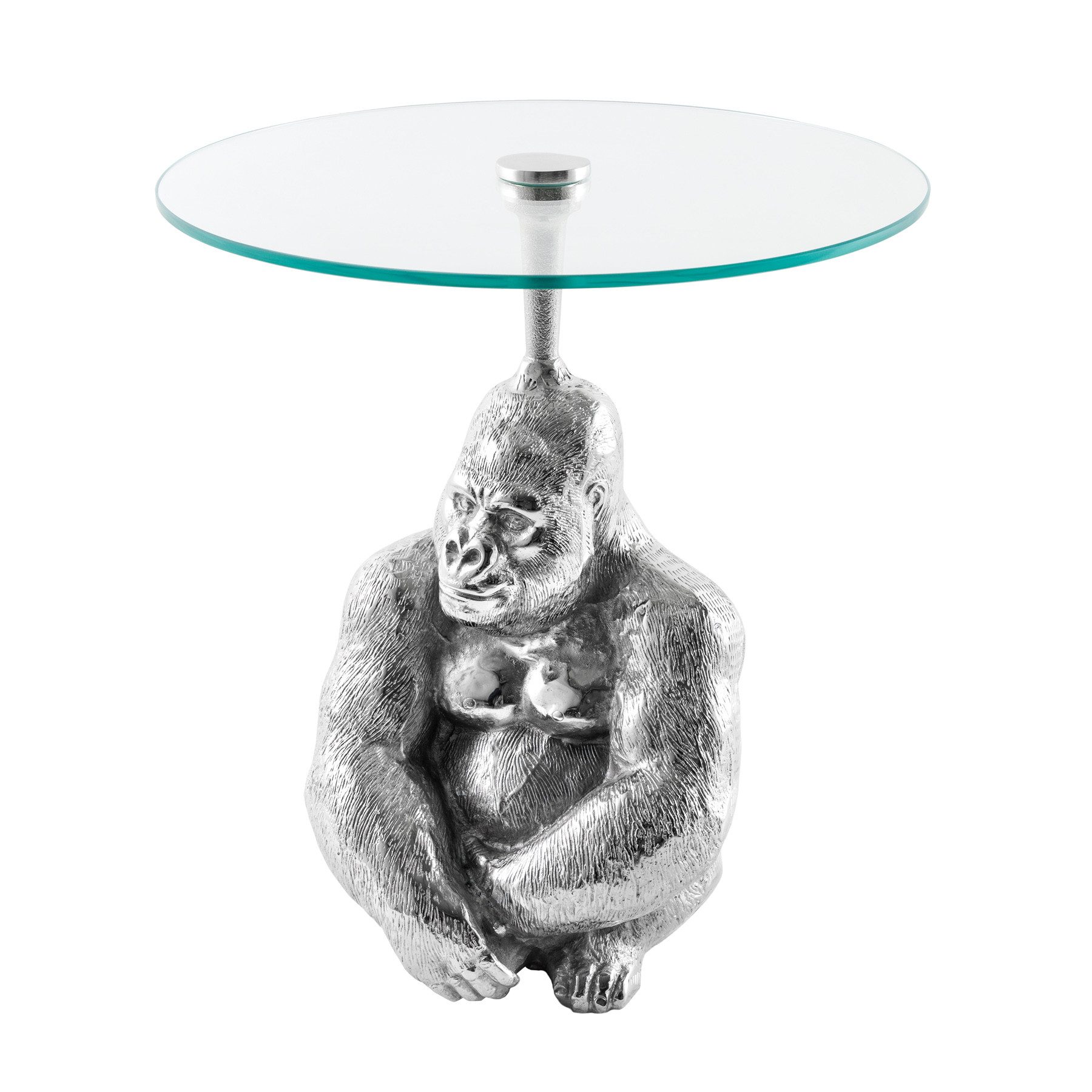 Tauche ein in die Welt der Eleganz und exotischen Designs mit unserem einzigartigen Beistelltisch. Die runde Glasplatte bietet nicht nur Funktionalität, sondern auch eine klare und zeitlose Ästhetik. Das Besondere an diesem Tisch ist die handgefertigte Affenfigur aus Silber, die dem Raum eine exotische Note verleiht und African Feeling versprüht. Die Affenfigur wurde mit Liebe zum Detail handgefertigt und setzt einen besonderen Akzent auf diesem Beistelltisch. Dieser Tisch wird nicht nur zu einem funktionalen Möbelstück, sondern auch zu einem Kunstwerk, das die Blicke auf sich zieht.