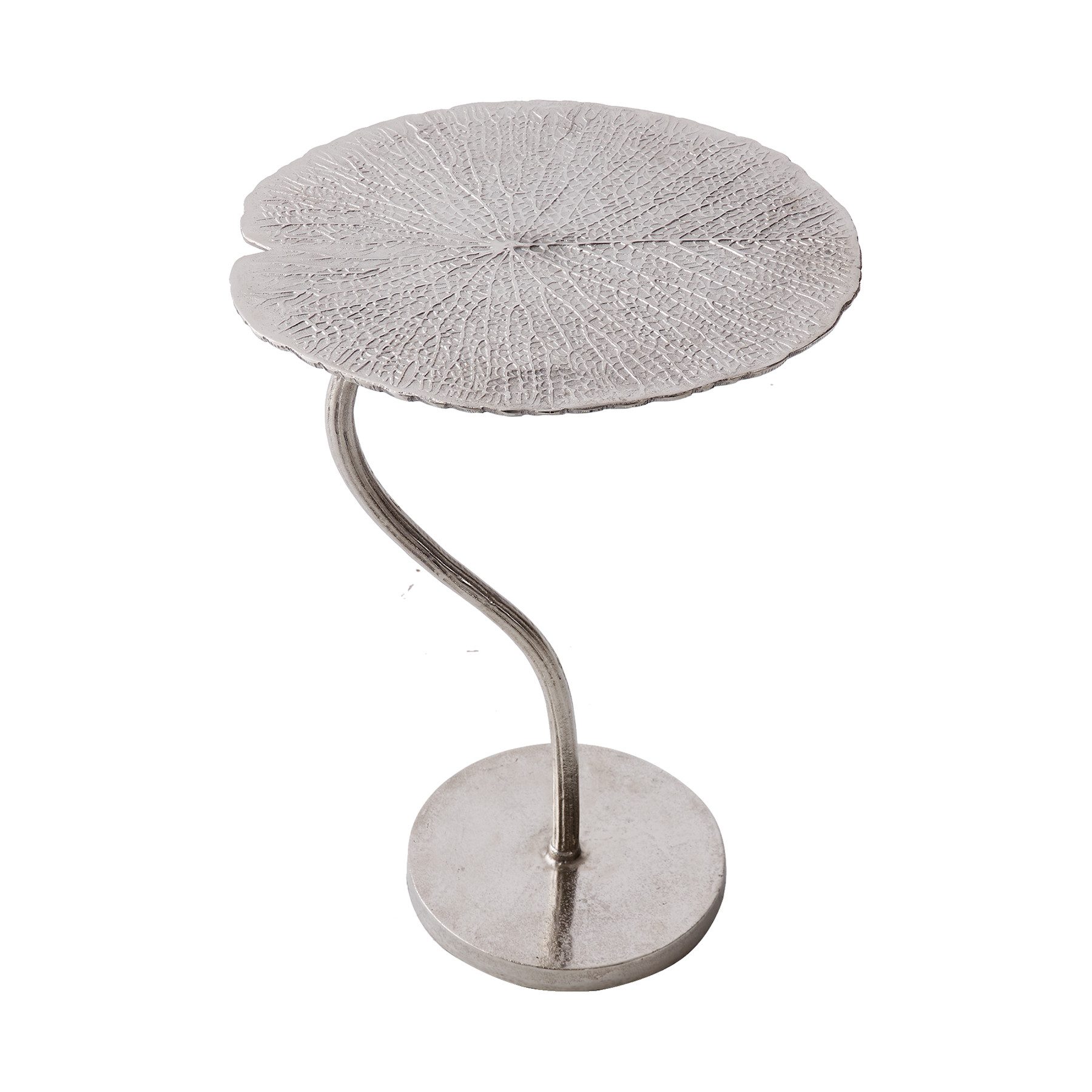 Dieser filigrane Tisch verzaubert schon auf den ersten Blick. Die Tischplatte in silber ist einem Blatt nachempfunden. Der gewellte Rand, die charakteristische Einkerbung und die Blattadern auf der Oberseite unterstreichen den authentischen Look des Blattes perfekt. Getragen wird die einzigartige Tischplatte von einem geschwungenen Gestell mit rundem Fuß, welcher einen kippelfreien Stand auf jedem Untergrund garantiert.