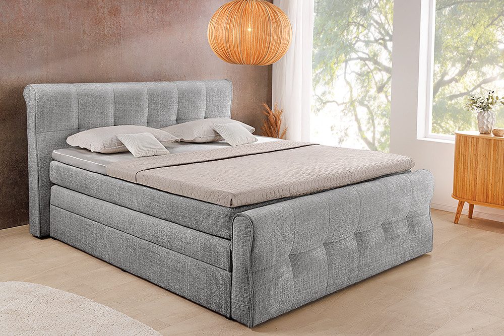 Boxspringbetten erfreuen sich immer größerer Beliebtheit – und das aus gutem Grund! Das durchdachte System aus zweifacher Federung bietet einen besonders hohen Schlafkomfort und kann Rückenschmerzen effektiv vorbeugen. Dieses moderne Boxspringbett ist mit einer Taschenfederkern-Polsterung sowie einem Komfortschaum-Topper ausgestattet, der selbstverständlich im Preis inbegriffen ist. Ein besonderes Highlight ist der integrierte Bettkasten, der praktischen Stauraum für Bettwäsche, Decken oder Kleidung bietet.