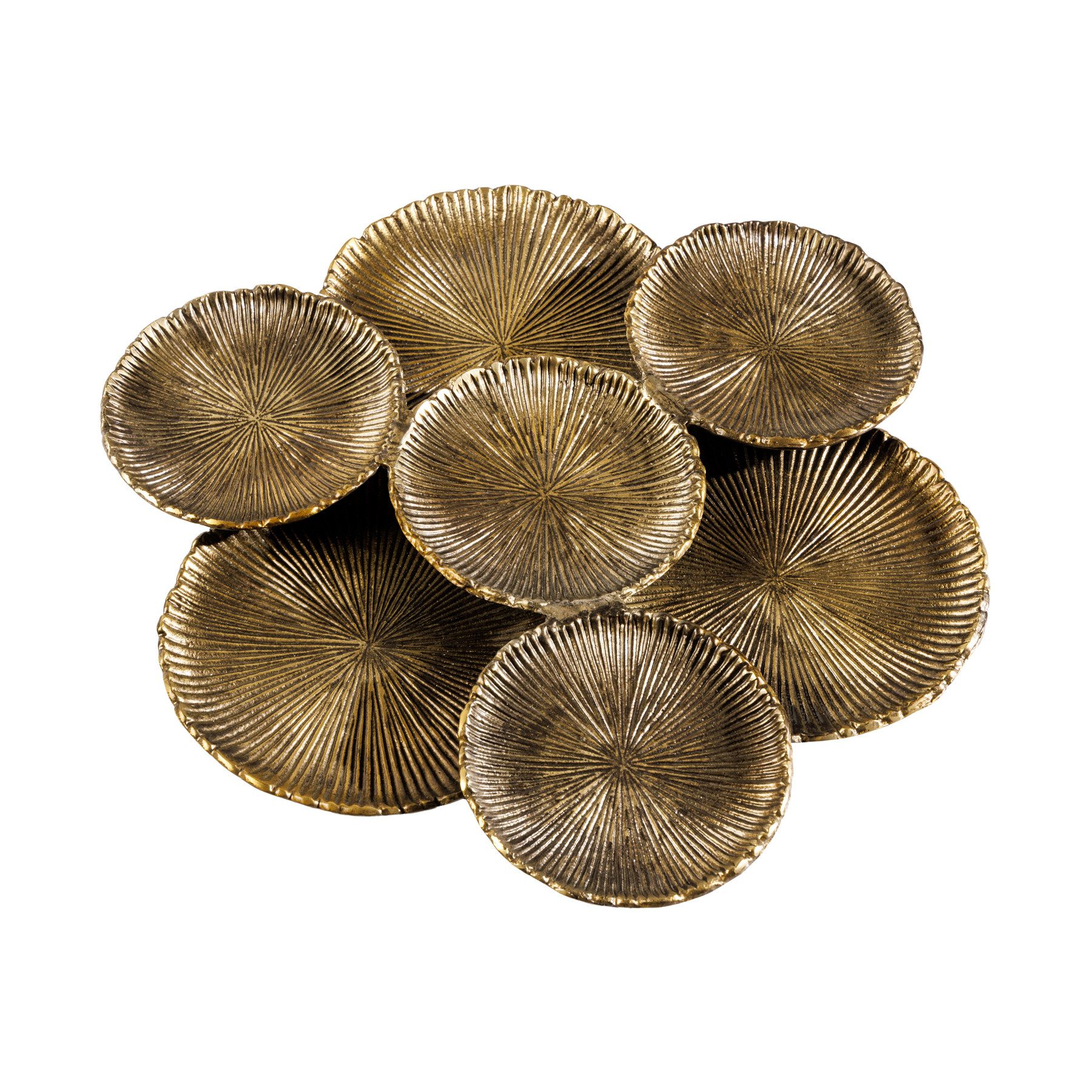 Diese Deko Schale ist nicht nur ein Accessoire, sondern eine regelrechte Hommage an Ästhetik und Eleganz. Die schöne Schale in XXL-Размер aus Metall-Aluminium-Legierung präsentiert sich in glänzendem Gold und fasziniert durch ihr kunstvolles Design. Das außergewöhnliche Blattmuster, bestehend aus insgesamt sieben kleinen und großen Schalen, die Seerosenblättern ähneln, verleihen diesem Dekorationsobjekt eine einzigartige Ausdruckskraft. Die filigrane Handwerkskunst machen diese Deko Schale zu einem wahren Blickfang.