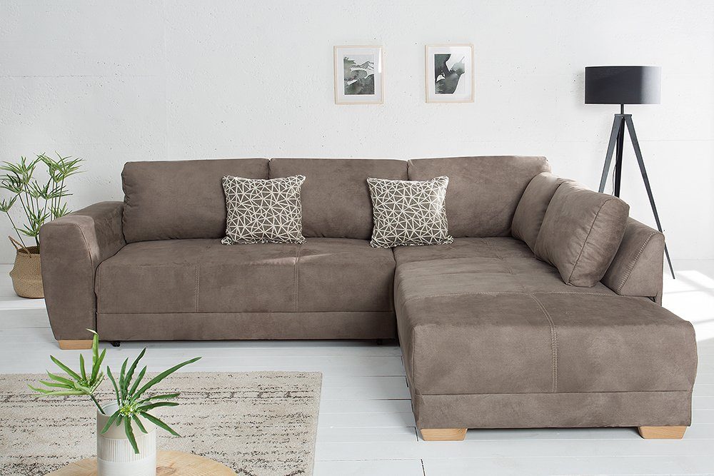 Modernes Design, toller Sitzkomfort und eine praktische Bettfunktion – dies alles finden Sie vereint in unserem Ecksofa NORWAY. Das zurückhaltende Design des Sofas können Sie problemlos in unterschiedlichste Einrichtungsstile integrieren. Der hochwertige Bezug in hellbraun wirkt dabei besonders zeitlos und wirkt in Kombination mit den Füßen in Eichenoptik sehr natürlich und wohnlich. Ein zusätzlicher Hingucken sind die farblich abgesetzten Zierkissen mit dezentem Muster, die Sie beim Kauf der Eckcouch mit dazu erhalten.