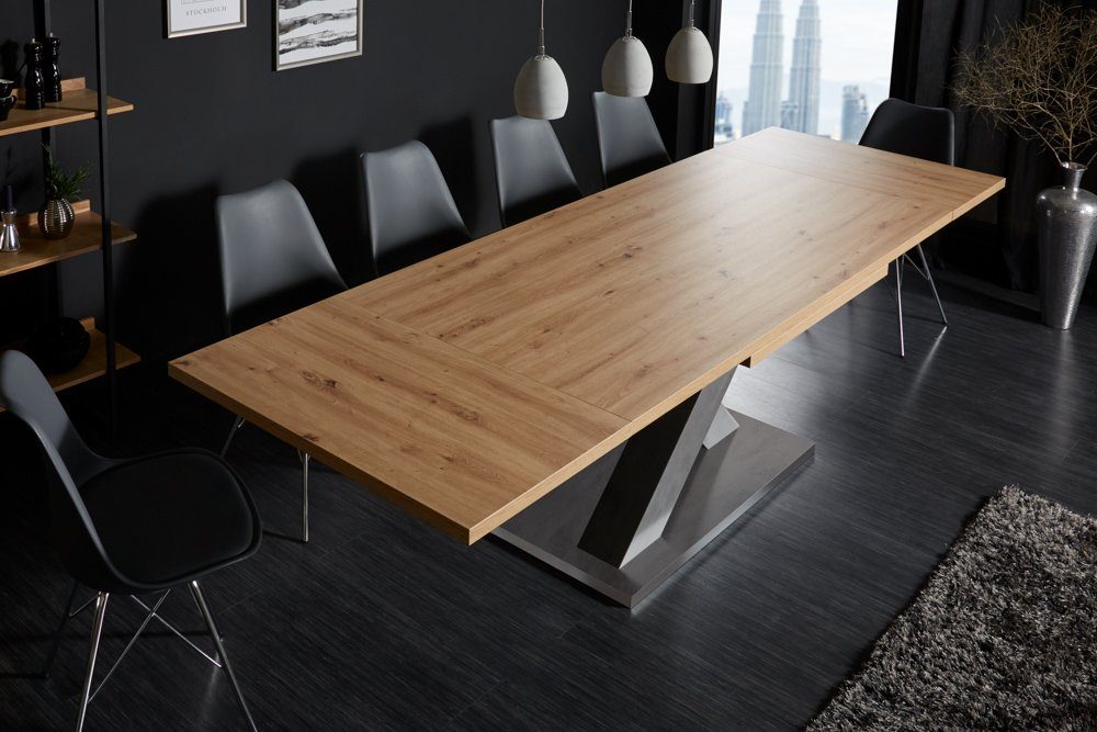 Auf dem imposanten X-Gestell ruht eine ausziehbare Tischplatte. So kannst Du den Tisch immer einfach genau der Gästeanzahl anpassen, die Du erwartest. Dank der beiden Einlegeplatten, die direkt im Tisch verstaut sind, lässt sich dieser von 180 cm im Handumdrehen auf 280 cm verlängern. Dies ist gerade bei größeren Familienessen oder einem geselligen Abend mit vielen Freunden besonders praktisch.