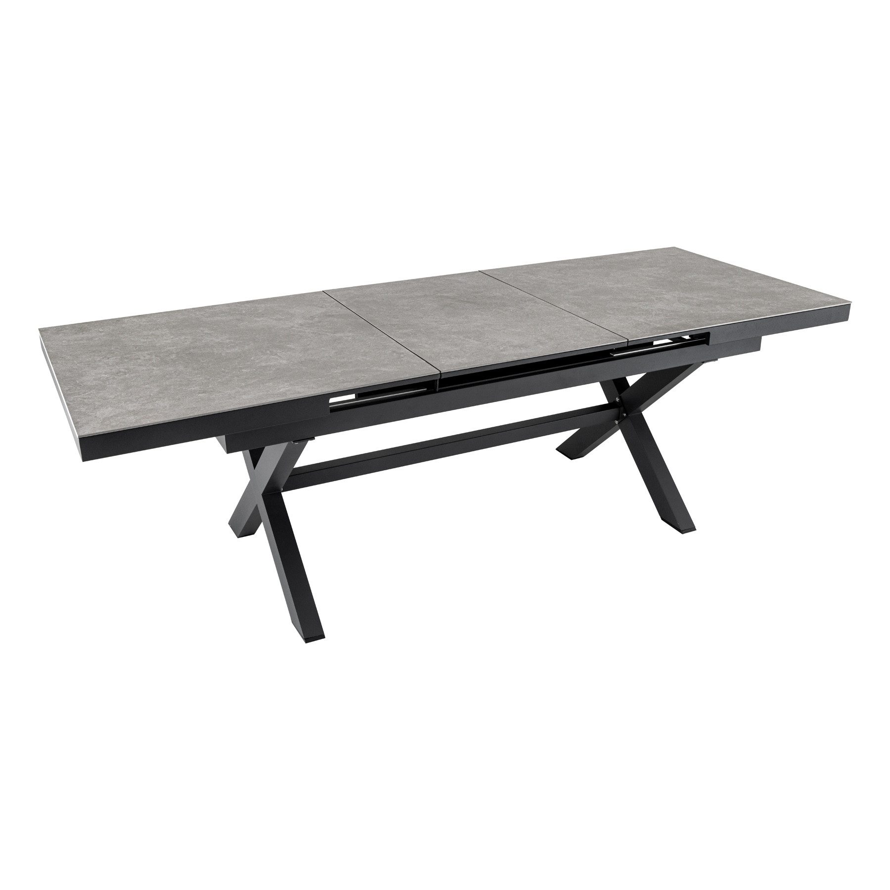 Die warmen Tage sind endlich da, und es ist Zeit, das Leben im Freien zu genießen - sei es mit einem ausgiebigen Frühstück auf der Terrasse oder einer geselligen Grillparty mit Freunden und Familie! Der ausziehbare GALAXIE Outdoor Esstisch ist dafür genau das Richtige. Seine großzügige Tischplatte aus hellgrauer Keramik in Graphit-Optik bietet Platz für alle, während mit dem robusten anthrazitfarbenen Aluminium X-Gestell für einen festen Stand gesorgt wird. Zudem ist er ausziehbar von 180 auf 240 cm, um noch mehr Gäste zu beherbergen. Der große Tisch ist wetterfest, frostfest und witterungsbeständig und trotzt so jedem Wetter. Mit seinem modernen Design fügt sich der Tisch nahtlos in jede Outdoor-Umgebung ein – Probiere es aus!