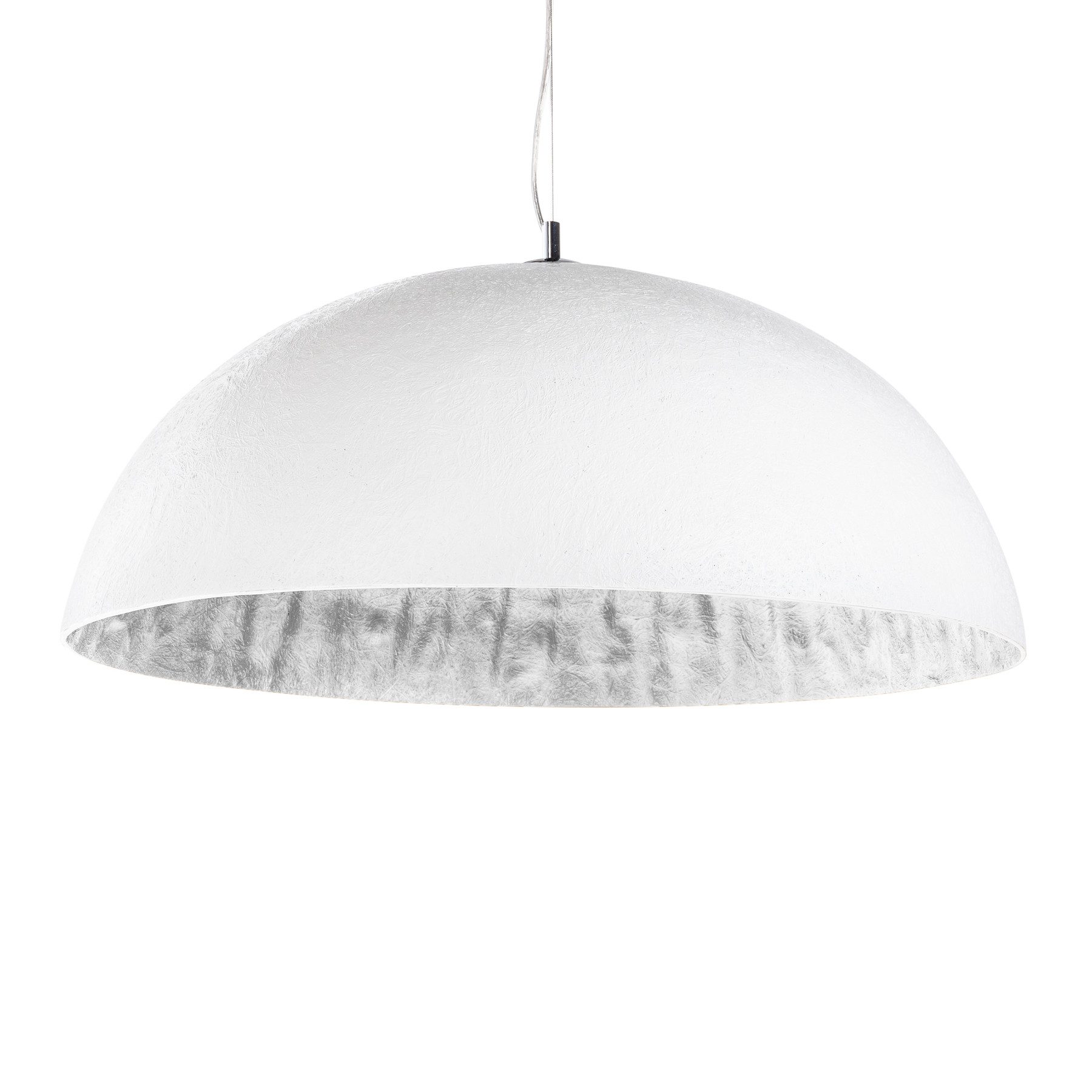 Verschaffen Sie Ihrem Esstisch oder Ihrem Wohnzimmer eine besonders warme und gemütliche Atmosphäre, mit der Design Hängeleuchte GLOW. Der große Schirm dieser prachtvollen Leuchte ist halbrund und aus Glasfaser und Fiberglasmaterial hergestellt und gibt durch den an der Innenseite in Silber gestalteten Reflektor ein gemütliches Licht indirekt in den Raum ab.