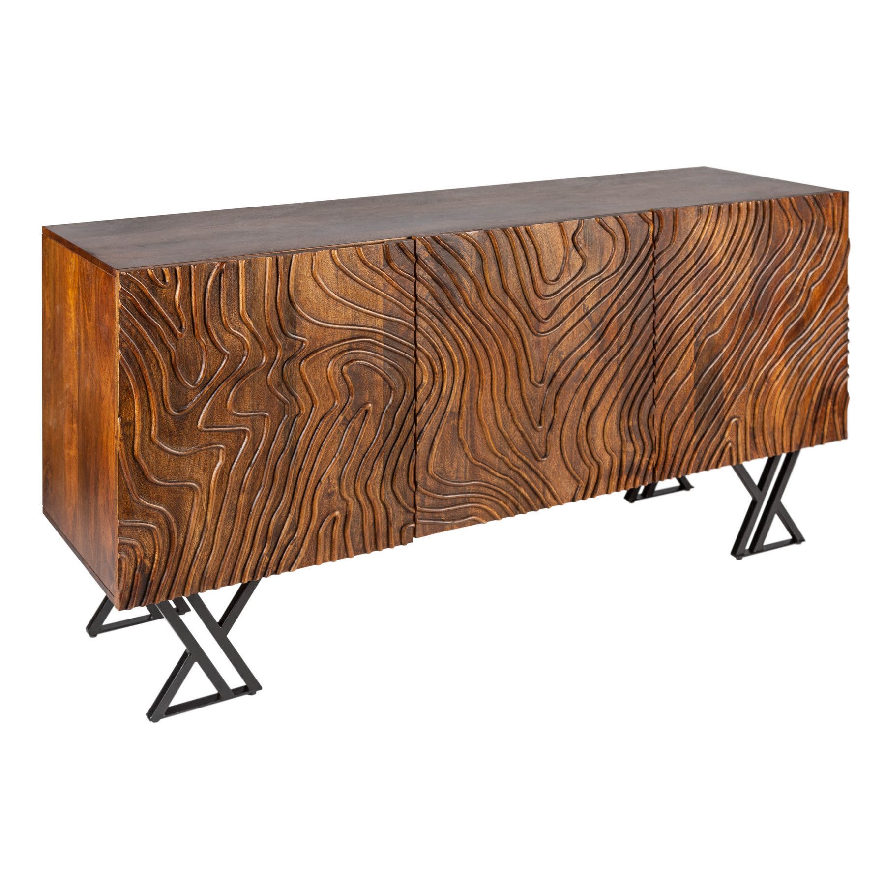 Hier trifft extravagantes Design auf ganz viel Stauraum. Das Sideboard FLUID begeistert auf den ersten Blick mit einer besonders aufwändigen Frontgestaltung. Das Mangoholz wurde mit einem besonderen Finish verdunkelt und die Front in aufwändiger Handarbeit mit einem organischen Muster veredelt. Die geschwungenen Linien laufen in zufällig angeordneten Mustern über das Holz, sodass jedes Board ein echtes Unikat ist, dessen Front immer einzigartig verziert wurde.