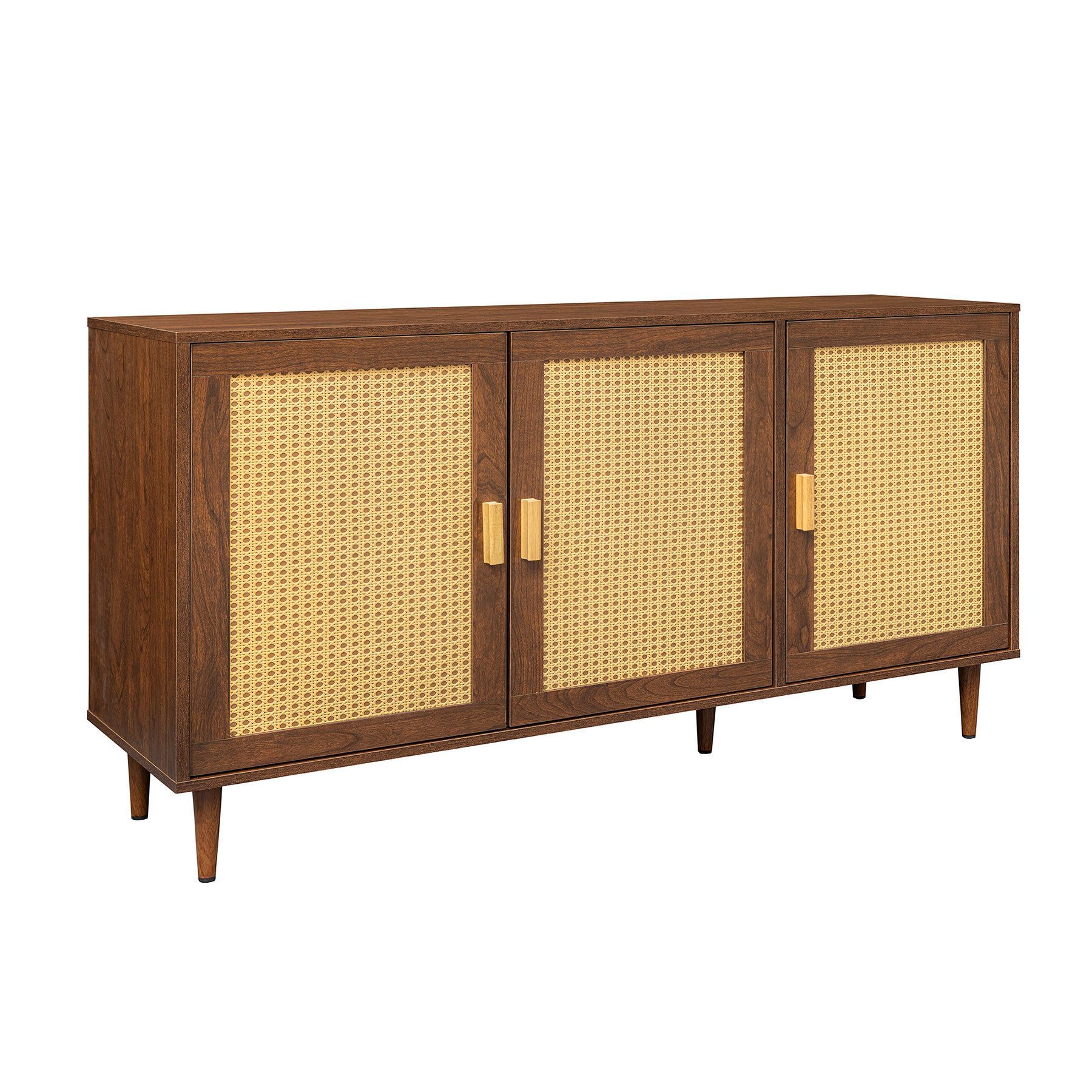 Dieses großzügige Sideboard vereint Design und Funktionalität in Perfektion. Die Türenfronten sind mit fein geflochtenem Wiener Geflecht im angesagten Boho-Stil gestaltet. Ergänzt wird der Rattan-Look durch elegante Griffe, die dem Möbelstück einen Hauch von Retro-Charme verleihen und das Design stilvoll abrunden.