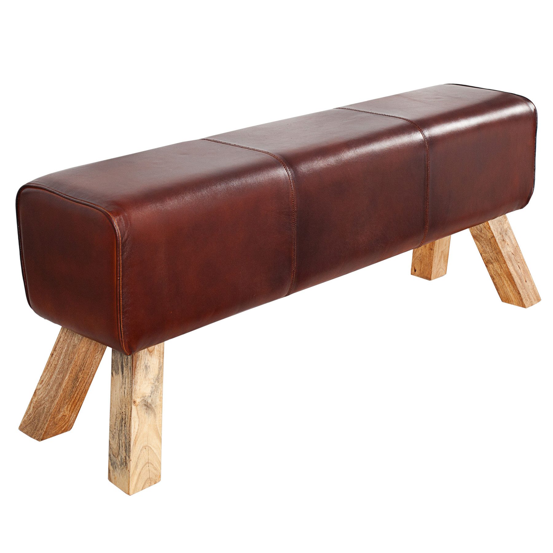Diese Bank ist ein Eyecatcher: Sie ist eine original nachempfundene Miniaturausgabe des bekannten Sportgeräts. Vor allem zu mehreren und in der Gruppe lässt sich dieses Möbelstück optimal zu einer Sitzlandschaft und Pausenecke arrangieren. Kultiges Schulsport Feeling pur! Lassen Sie diese Sitzgelegenheit zu einem ganz besonderen Wohnaccessoire werden! Der aufwendig mit echtem Leder bezogene Korpus präsentiert sich mit robustem Stand auf vier Massivholzbeinen - die Bank wird garantiert alle Blicke auf sich ziehen.