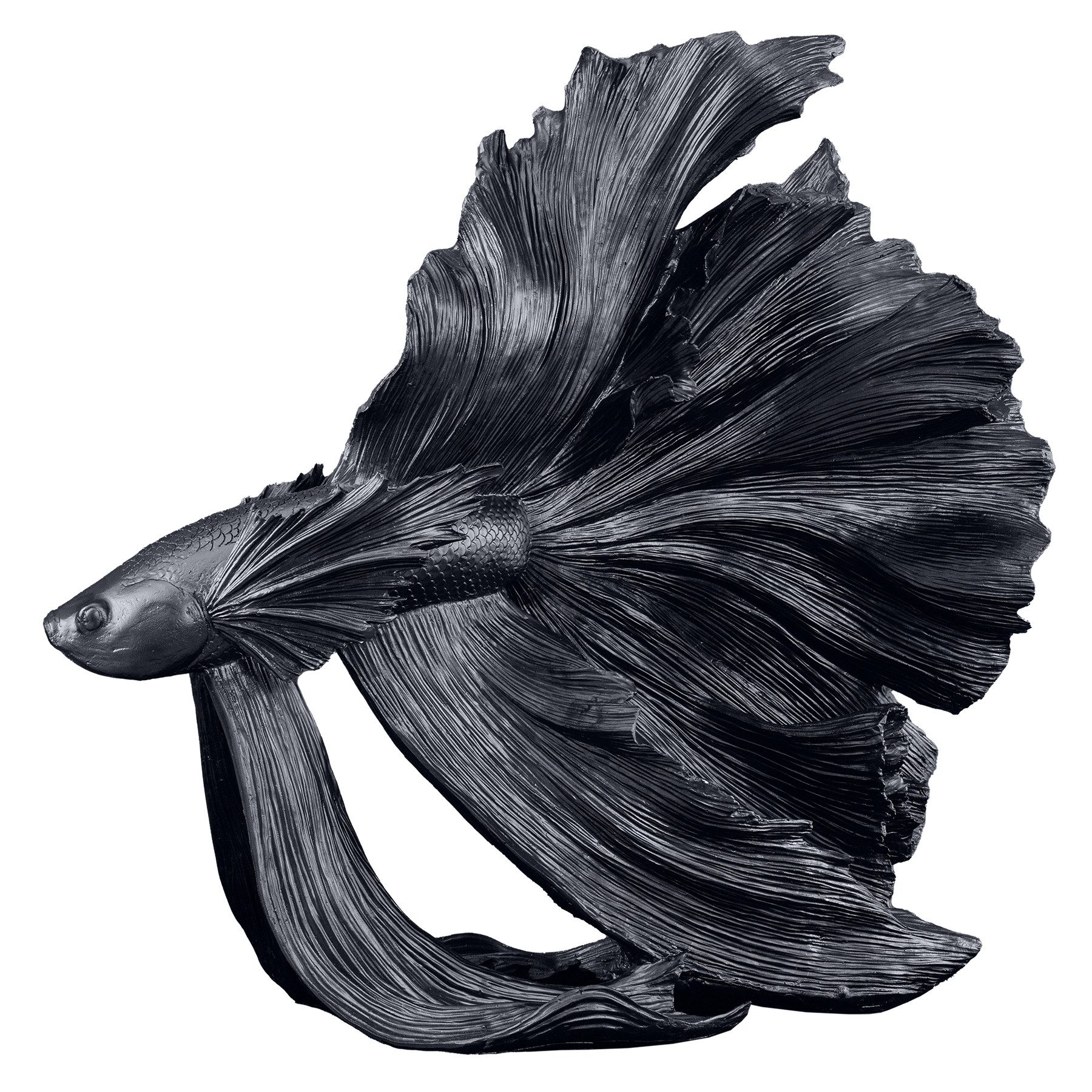 Wir bringen die Unterwasserwelt in Dein Zuhause! Das Deko-Objekt CROWNTAIL in Form eines siamesischen Kampffisches wird zum absoluten Highlight – egal ob Wohnzimmer, Flur oder Badezimmer. Durch ihr pompöses Auftreten ist die Deko-Figur ein exklusiver Blickfang für ein extravagantes Wohnambiente. Die stützende Flosse lässt die schwarze Fisch-Dekoration schweben – fast so als würde der majestätische Kampffisch durch Dein Wohnzimmer schwimmen! Dank der detailgetreuen Ausarbeitung der Fisch-Dekoration wird die Skulptur in Schwarz zum absoluten Eyecatcher in Deinem Zuhause.