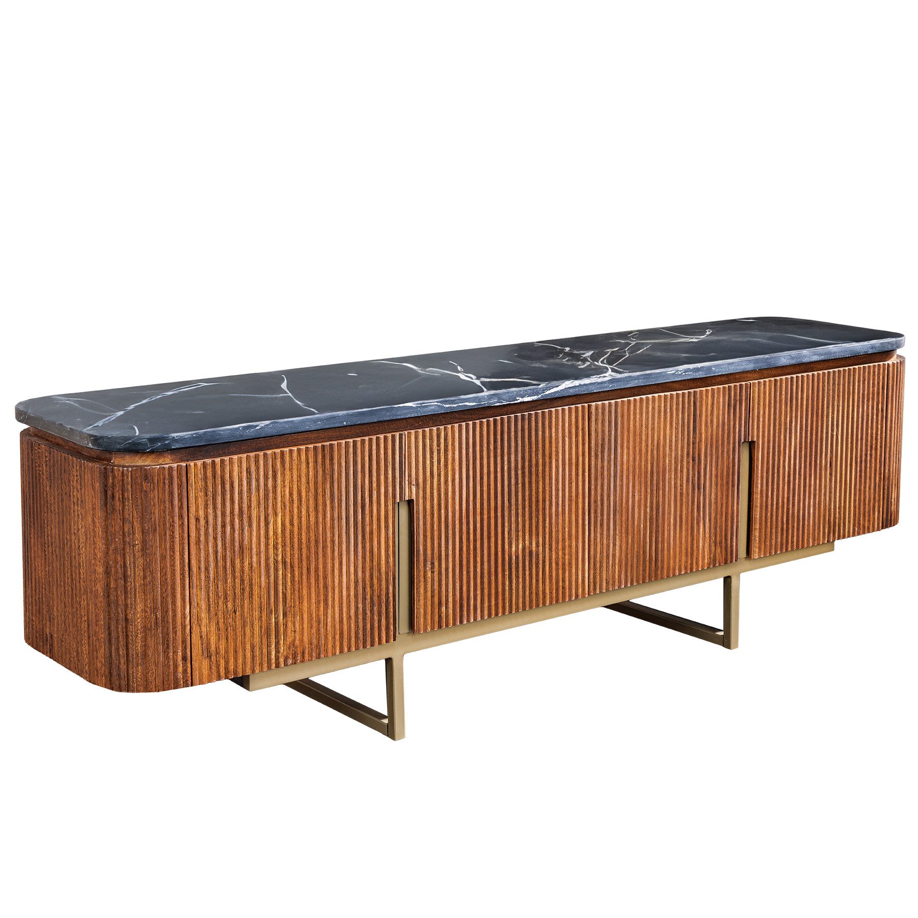 Das TV-Board GATSBY vereint edles Design mit funktionalem Stauraum. Der Korpus aus schwarz lackiertem Mangoholz verleiht dem Lowboard eine moderne, zeitlose Ausstrahlung, während die geriffelten Fronten und die sanften Rundungen an den Seiten den Retro-Charakter stilvoll unterstreichen. Abgerundet wird das Design durch ein filigranes Metallgestell in goldfarbener Lackierung, das für Leichtigkeit und einen Hauch von Luxus sorgt.