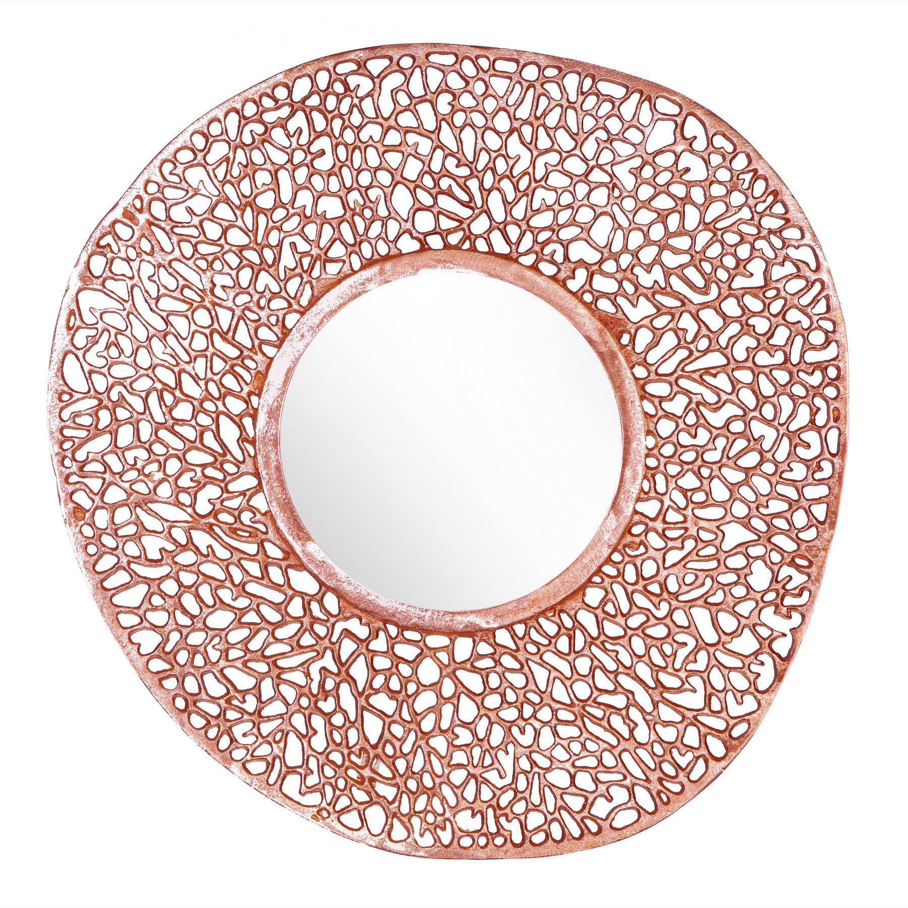 Dieser Spiegel ist viel mehr als nur ein Spiegel! Dank seines auffälligen, kupfernen Rahmens in einem filigranen Muster ist er zugleich ein wunderschönes Wohn-Accessoire. Das Muster erinnert an die feinen Verästelungen eines getrockneten Blatts und vereint damit glamourösen Stil mit einem Hauch von natürlichem Charme. Dabei wurde der Rahmen bewusst etwas unregelmäßig gestaltet, um den Stil des natürlichen Blättermusters zu unterstreichen.