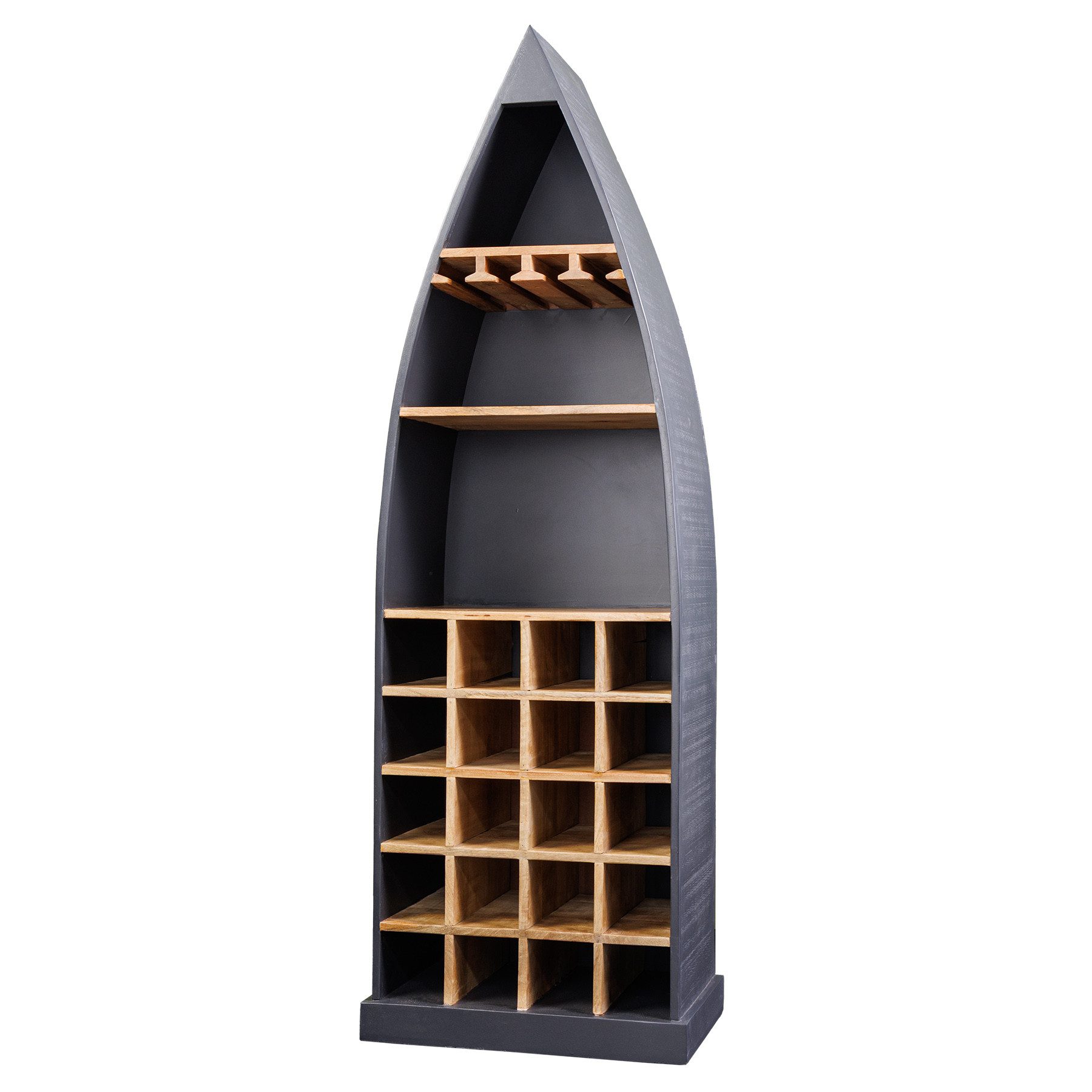 Das Weinregal SEVEN SEAS kombiniert funktionale Aufbewahrung mit außergewöhnlichem Design. Die markante Bootsform verleiht dem Regal einen maritimen Charakter und macht es zu einem stilvollen Hingucker in jedem Wohnbereich. Der Korpus aus massivem Mangoholz ist in elegantem Anthrazit gehalten, während die Regalfächer in natürlicher Holzoptik einen warmen Kontrast bieten. Die lackierte MDF-Rückwand sorgt dafür, dass das Regal auch frei im Raum platziert werden kann.