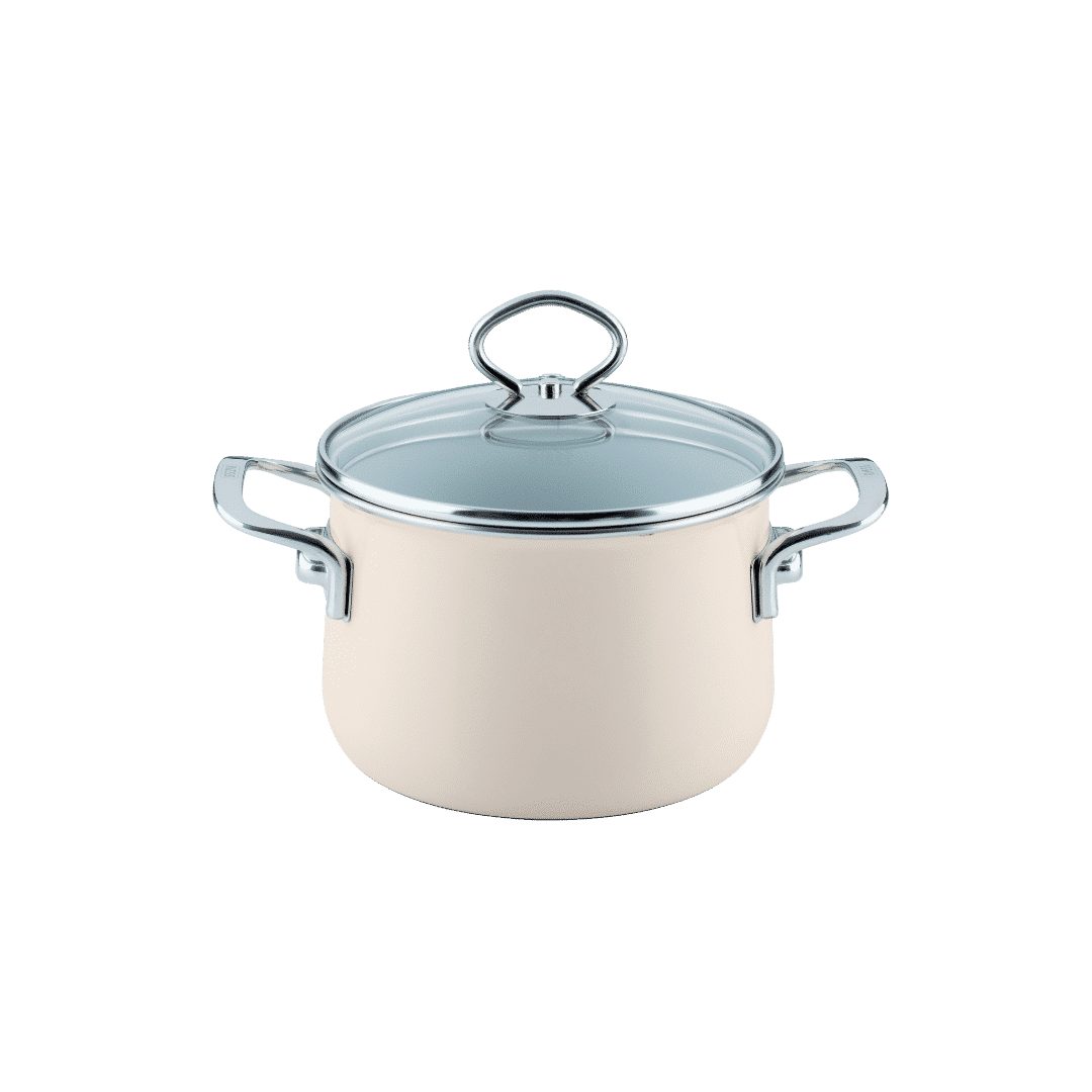 Die hohen Kochtöpfe oder Fleischtöpfe der Serie Nouvelle bestechen durch modernes Design und einen spannenden Materialmix. Die Fleischtöpfe mit Sichtglasdeckel haben handlich geformte Edelstahlgriffe in modernem Design. Der Deckel des Nouvelle Fleischtopf ist aus Glas und hat ebenfalls einen Edelstahlgriff. Der extra-starke Stahl- Wärmespeicherboden des Topfes sorgt dafür, dass sich die Wärme gleichmäßig und rasch verteilt. Dank der guten Wärmeleitung Emaille werden auch die Topfwände rundum warm, das spart Energie. Der robuste Chromrand verhindert das Abschlagen.