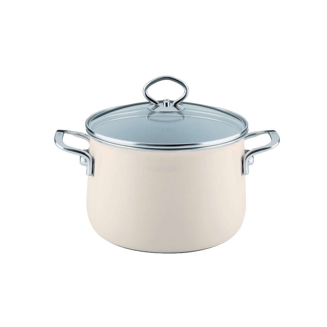 Die hohen Kochtöpfe oder Fleischtöpfe der Serie Nouvelle bestechen durch modernes Design und einen spannenden Materialmix. Die Fleischtöpfe mit Sichtglasdeckel haben handlich geformte Edelstahlgriffe in modernem Design. Der Deckel des Nouvelle Fleischtopf ist aus Glas und hat ebenfalls einen Edelstahlgriff. Der extra-starke Stahl- Wärmespeicherboden des Topfes sorgt dafür, dass sich die Wärme gleichmäßig und rasch verteilt. Dank der guten Wärmeleitung Emaille werden auch die Topfwände rundum warm, das spart Energie. Der robuste Chromrand verhindert das Abschlagen.