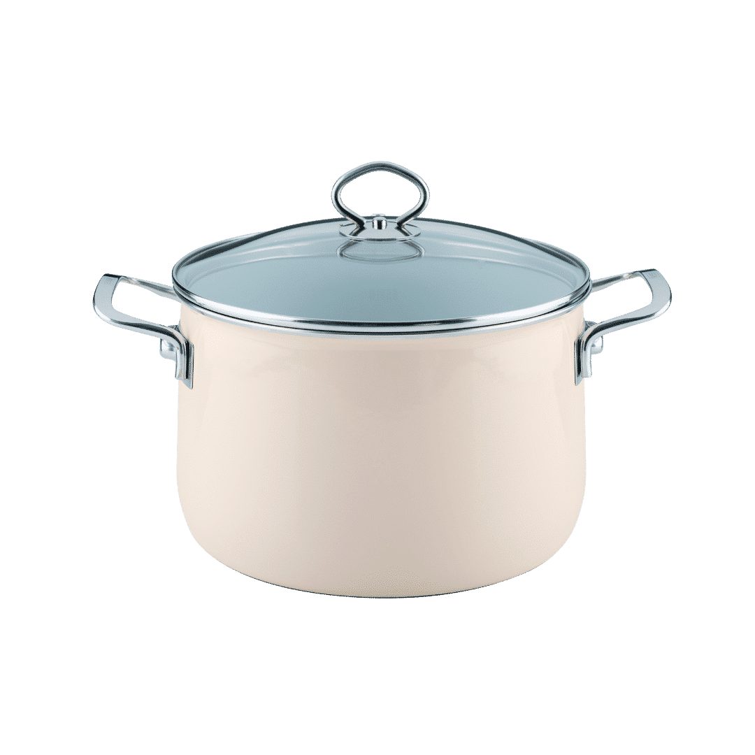 Die hohen Kochtöpfe oder Fleischtöpfe der Serie Nouvelle bestechen durch modernes Design und einen spannenden Materialmix. Die Fleischtöpfe mit Sichtglasdeckel haben handlich geformte Edelstahlgriffe in modernem Design. Der Deckel des Nouvelle Fleischtopf ist aus Glas und hat ebenfalls einen Edelstahlgriff. Der extra-starke Stahl- Wärmespeicherboden des Topfes sorgt dafür, dass sich die Wärme gleichmäßig und rasch verteilt. Dank der guten Wärmeleitung Emaille werden auch die Topfwände rundum warm, das spart Energie. Der robuste Chromrand verhindert das Abschlagen.