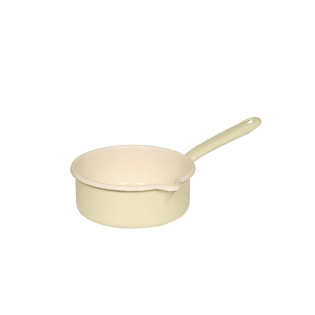 Die Stielkasserolle ist als Milchtopf, Saucentopf u.v.m.ein beliebtes Küchenhelferlein. Der Rand ist rund geschwungen – Bördelrand in der Emaillesprache – dabei wird das Metall gebogen, um einen runden und stabilen Rand zu erzeugen. Der Haltegriff ist aus Emaille und hat ein Loch, damit das schöne Stück auch dekorativ in der Küche aufgehängt werden kann und immer griffbereit ist.