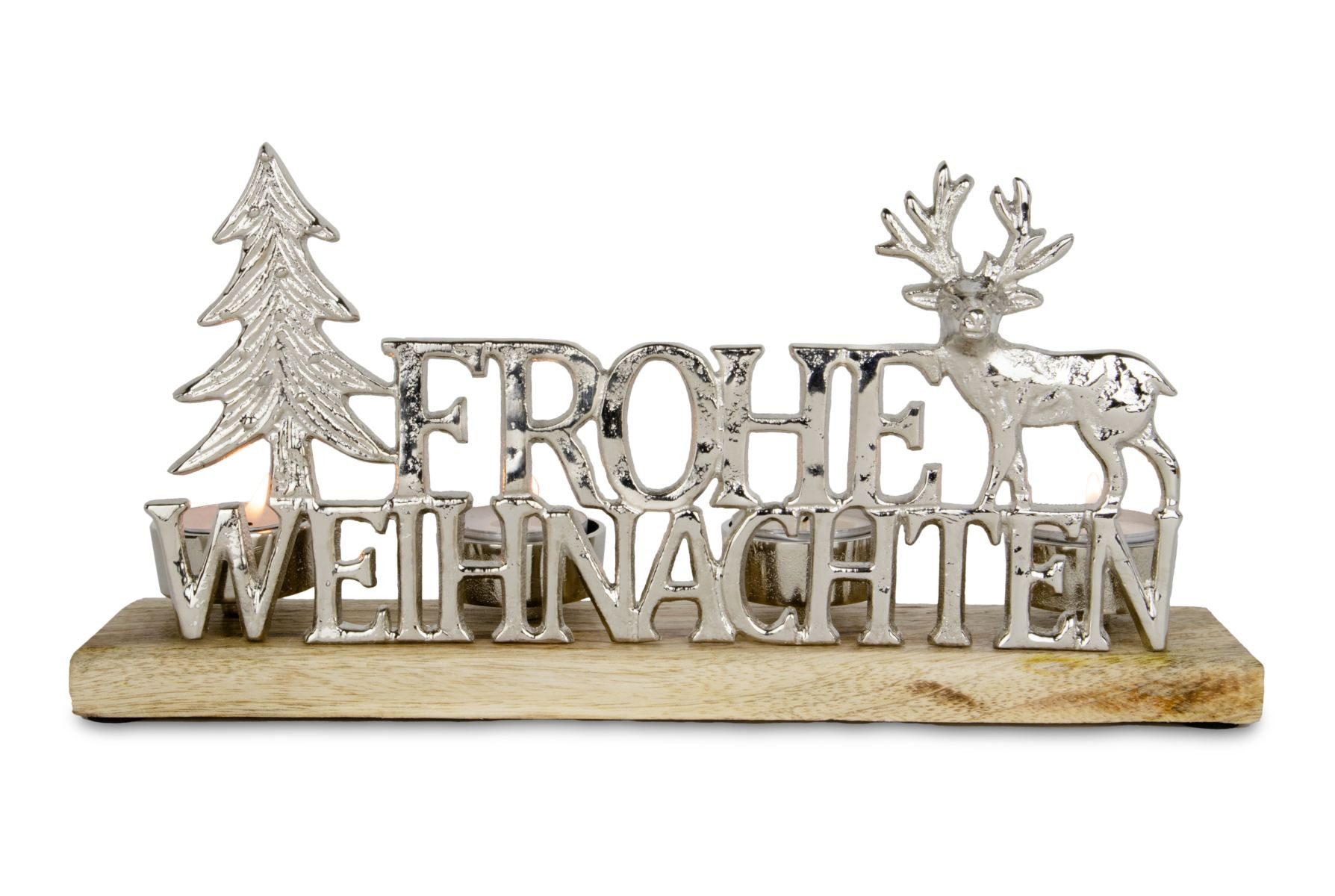 Edle Deko mit Hirsch, Tanne & Frohe Weihnachten-Schrift aus Metall in Silberoptik