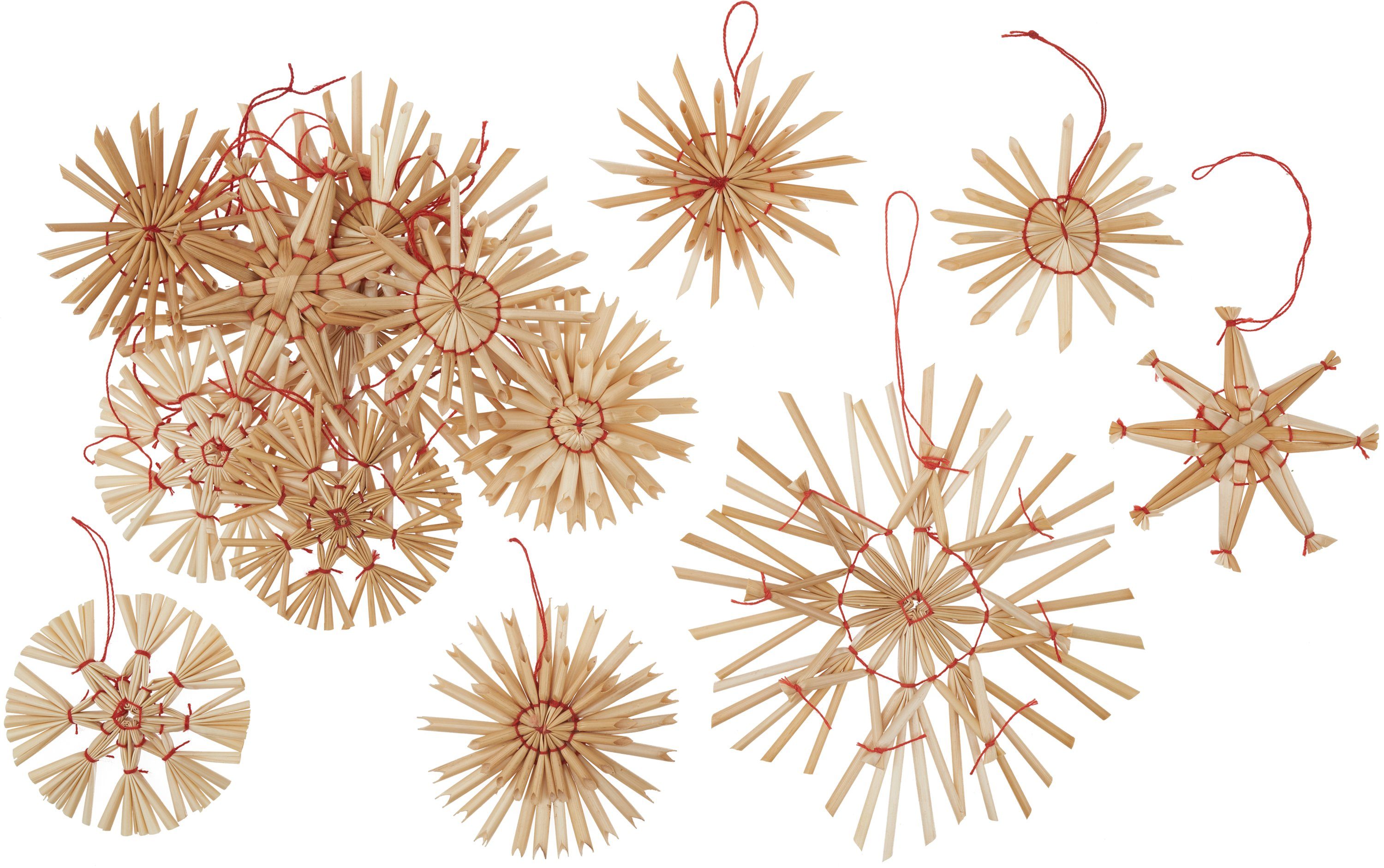 Dieses zauberhafte Strohsterne 'Меню II' mit 14 Sternen, Размер 6-12 cm, ist aus Stroh gefertigt und gebunden mit rotem Garn. Der Aufhänger ist ebenfalls aus rotem Garn. Eine traditionelle Dekoration für den Adventskranz, Tannenbaum Zweige, Girlanden und Türkranz oder zum Verzieren von Geschenkverpackungen.