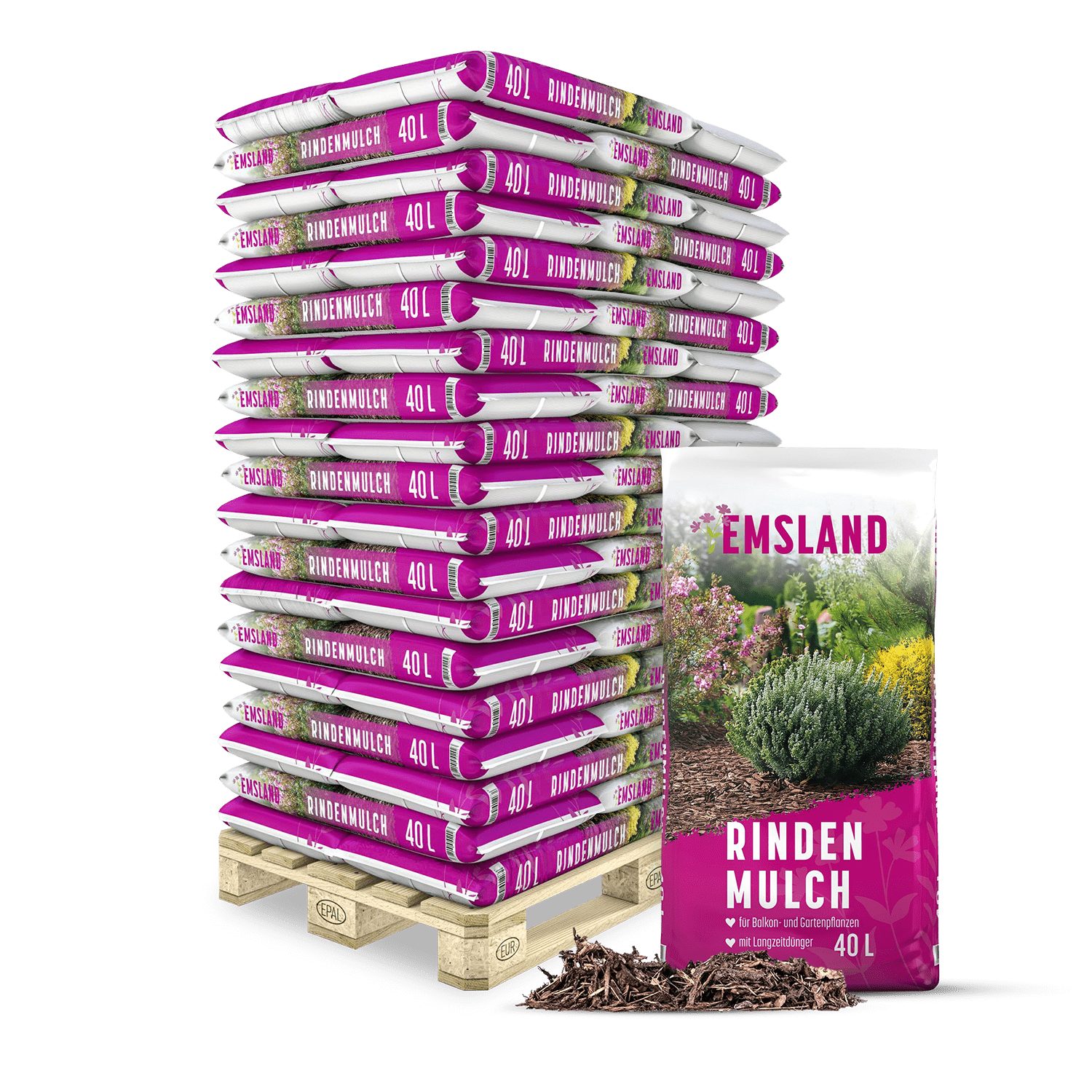 Der EMSLAND Rindenmulch in der Körnung 0–40 mm ist ein naturbelassenes Abdeckmaterial aus zerkleinerter Nadelholzrinde. Auf Pflanzflächen, Gartenwegen oder unter Sträuchern schützt er den Boden zuverlässig vor Austrocknung, Erosion und unerwünschtem Unkraut. Gleichzeitig sorgt er für eine gleichmäßige Temperaturverteilung und trägt zur Feuchtigkeitsspeicherung bei – ganz ohne chemische Zusatzstoffe. Der Rindenmulch verbessert auf natürliche Weise die Bodenstruktur, reguliert den Wasserhaushalt und unterstützt das Pflanzenwachstum nachhaltig. Durch seine organische Zusammensetzung versorgt der Mulch den Boden mit wertvollen Stoffen und fördert die Humusbildung. Er schafft ideale Lebensbedingungen für Mikroorganismen und trägt so zu einem aktiven, gesunden Bodenleben bei. Aufgrund des hohen Kohlenstoff-Stickstoff-Verhältnisses wird Stickstoff gebunden – wir empfehlen daher, vor dem Aufbringen eine Grunddüngung mit Hornspänen oder ähnlichen Mitteln vorzunehmen. Auch zur Verbesserung von Kompost eignet sich der EMSLAND Rindenmulch hervorragend. Vermischt mit rund 20 % Mulchanteil wird die Durchlüftung erhöht, Verdichtungen im Kompost werden vermieden, und der Rotteprozess wird beschleunigt. Dieses Produkt ist ausschließlich für den Einsatz im Zierpflanzenbau im Hobbygarten vorgesehen und nicht für die Erzeugung von Lebensmitteln zugelassen. Bei Anwendung auf landwirtschaftlich genutzten Flächen sind die geltenden Regelungen des Abfall-, Wasser- und Düngerechts zu beachten. Hinweise zur richtigen Anwendung und Lagerung finden Sie auf der Verpackung. Bestellen Sie den EMSLAND Rindenmulch bequem online. Geliefert wird eine Palette mit 57 Säcken à 40 Litern im praktischen Speditionsversand. Durch eine vorherige Terminabsprache oder eine Abstellgenehmigung bleiben Sie am Liefertag flexibel. Die Zustellung erfolgt zuverlässig bis an Ihre Bordsteinkante.