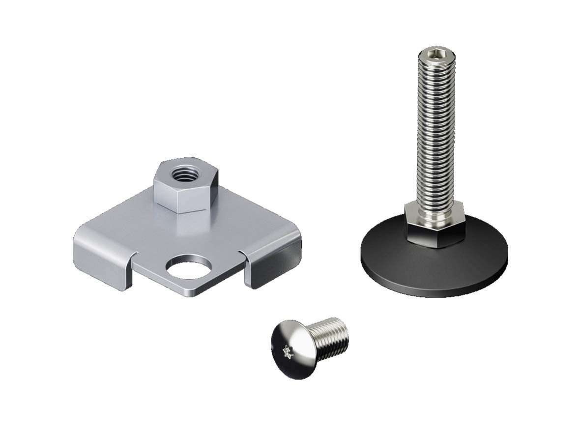 Packungsinhalt | 4 x verstellbare Nivellierfüße, Montageteile, 4 Montagehalterungen |
