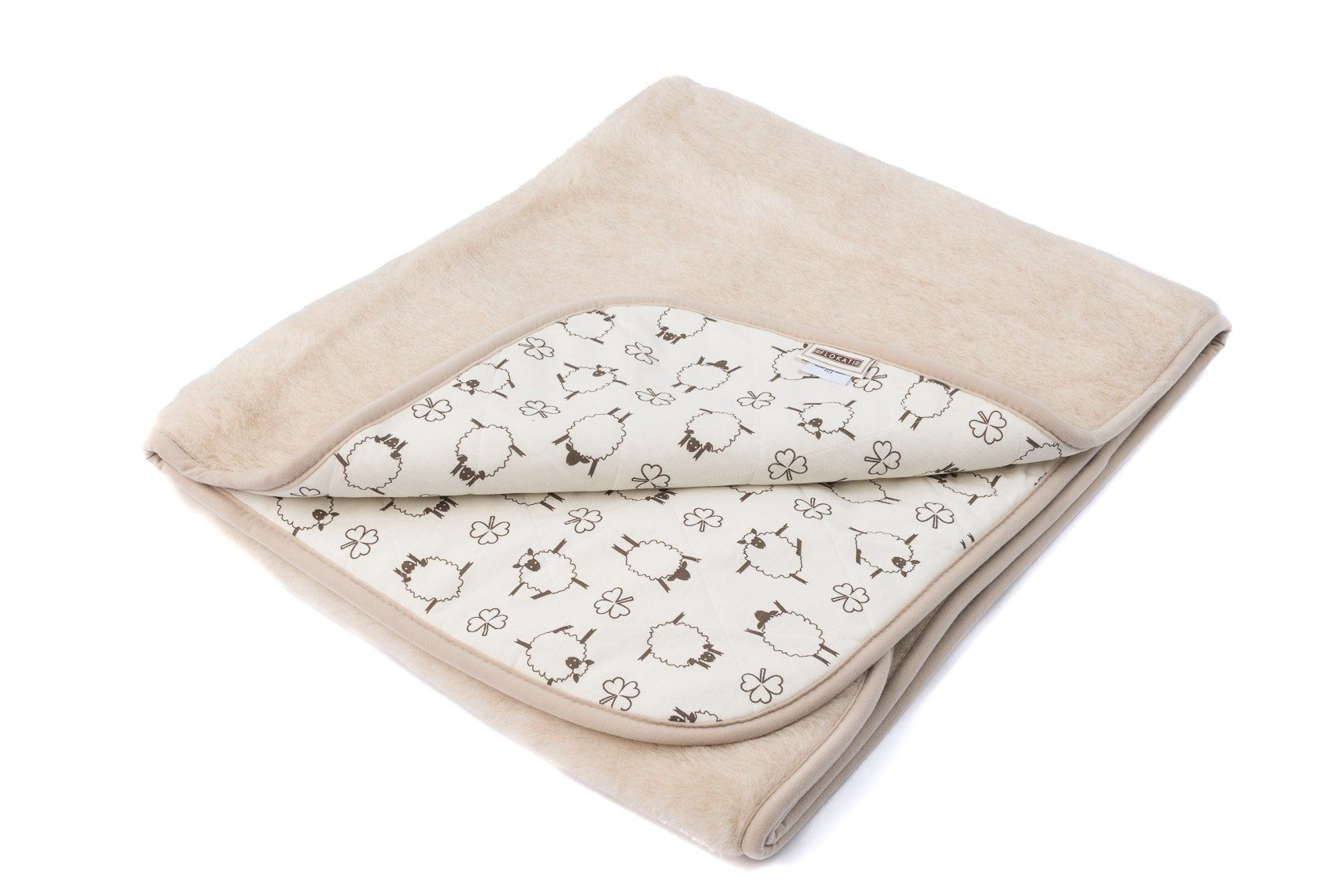 Die Rückseite der Wolldecke ist mit einem Baumwollstoff aus 100 % Baumwolle mit bedruckten Schafen abgesteppt.
