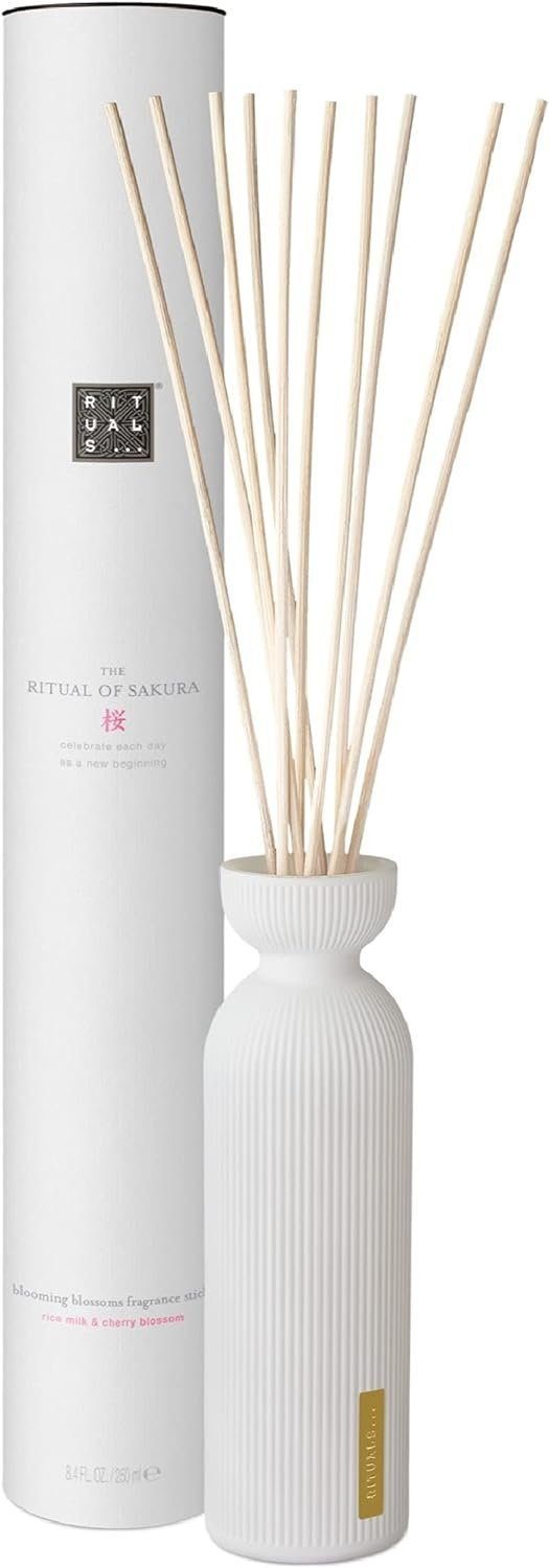 Die Mini Fragrance Sticks aus der Serie The Ritual of Sakura verströmen den zarten Duft von Kirschblüten und Reismilch. Sie sind ideal für kleine Räume wie Gästebäder oder Schlafzimmer bis 8 m² und schaffen dort eine angenehme, harmonische Atmosphäre.