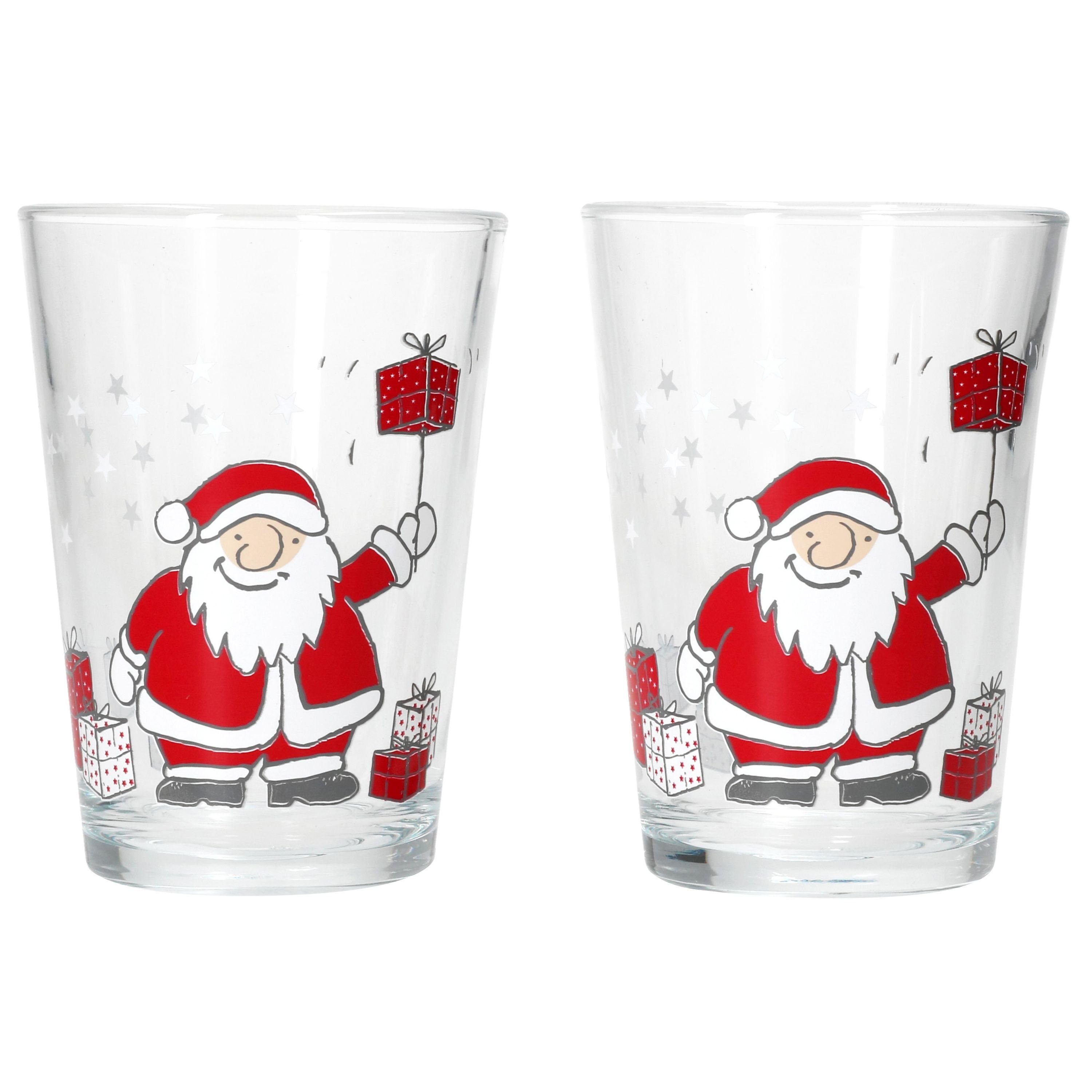 Das Trinkglas ist aus Klarglas gefertigt und auf einer Seite mit einem schnuckeligen Weihnachtsmann versehen, der von Geschenken und Sternen umgeben ist. Er trägt sein weihnachtliches Gewand mit roter Zipfelmütze, hält ein schwebendes Geschenk mit Hilfe einer Schnur fest und grinst Sie fröhlich durch seinen weißen Bart an. Die konischen Teegläser können zur platzsparenden Aufbewahrung ineinander gestapelt werden.