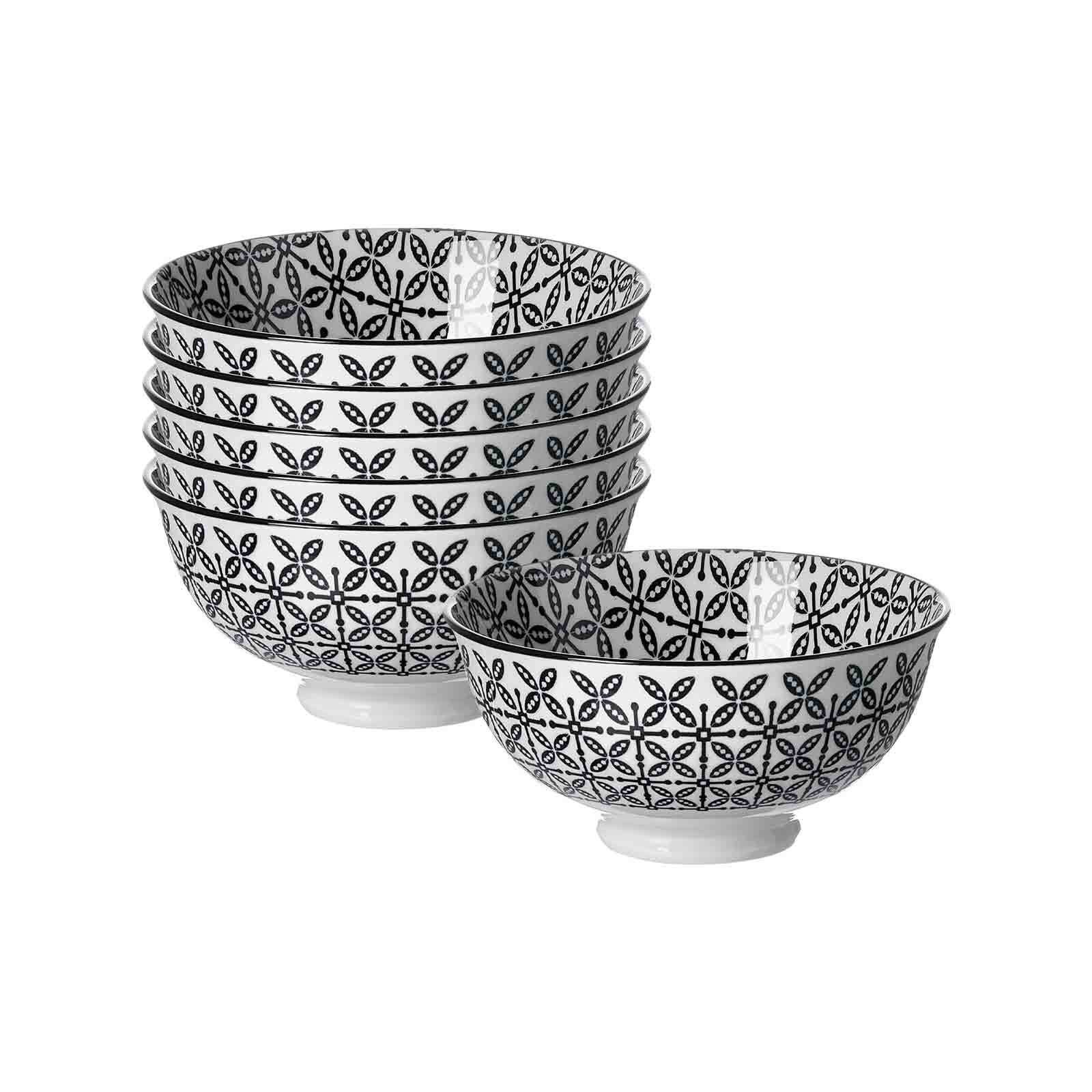 Artikeldetails: Durchmesser: ca. ø 12 cm Höhe: ca. 6 cm Material: Porzellan Merkmal: Spülmaschinengeeignet Farbe: schwarz-weiß Lieferumfang: 6x Servierschale