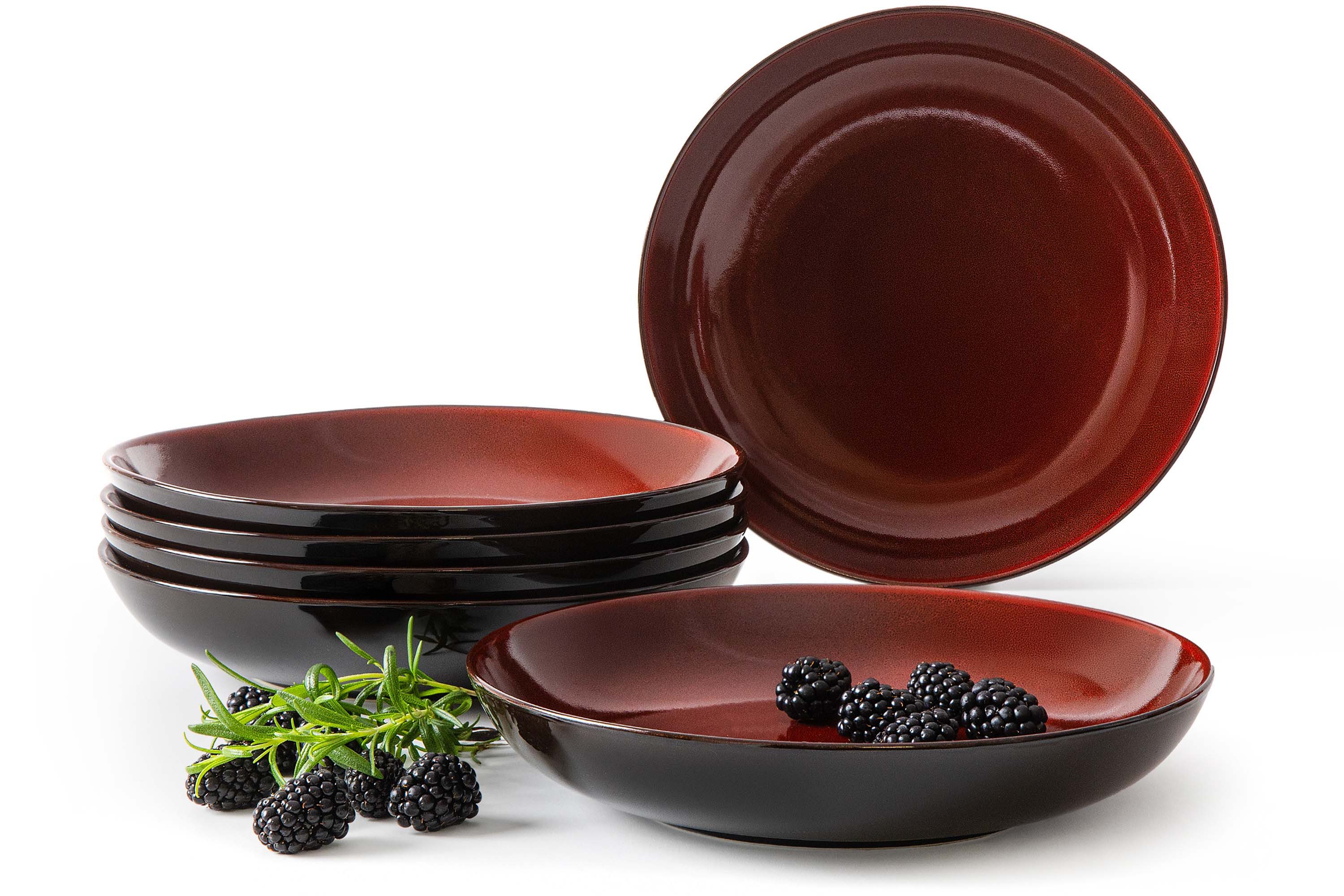 Die glänzenden schwarzen Akzente in Kombination mit den roten Farbtönen bilden einen modernen Kontrast und verleihen jedem Tisch eine stilvolle Eleganz.