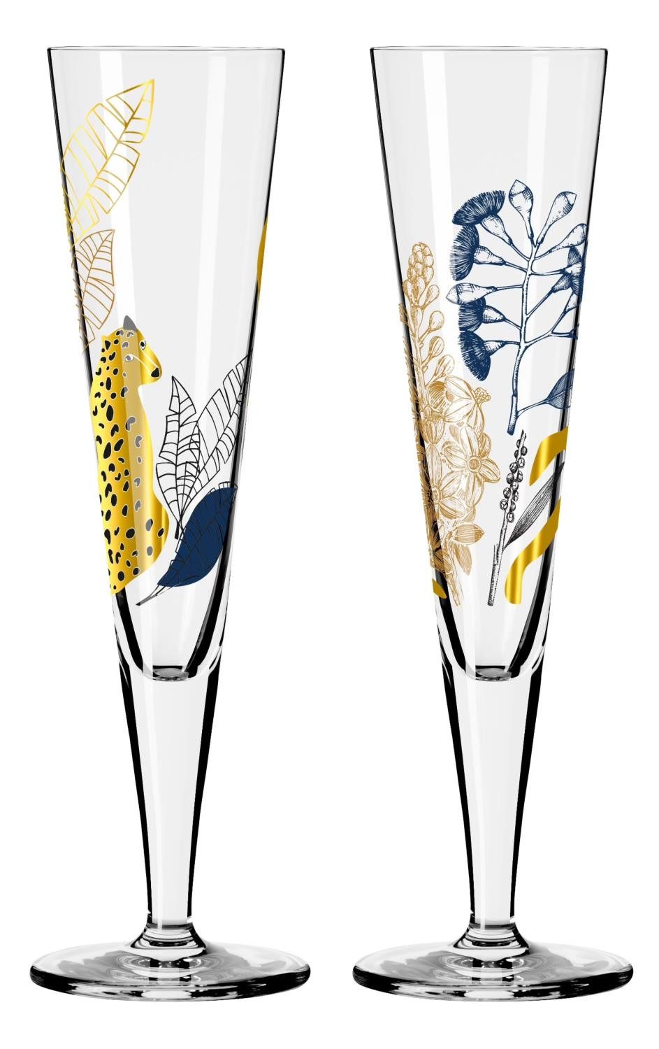 Lieferumfang: 2 Champagnergläser in Geschenkkartons, Kollektion: Frühjahr 2023 Maße: Höhe 24cm, Durchmesser 7cm; maximale Füllmenge 200ml, empfohlene Füllmenge 180ml Motiv: Gepard & Blätter Material: Hochwertiges Kristallglas Handwäsche empfohlen - Ritzenhoff Markenqualität, Made in Germany Das eine Champusglas ziert ein glänzender Gepard. Diese elegante Großkatze der Savanne symbolisiert die verborgenen und flüchtigen Glücksmomente, die bei einer erfrischenden Begegnung mit Freunden bewahrt werden. Das andere Glas wird von zarten Eukalyptusblättern umrahmt. In den Farben Blau, Gold und Schwarz verströmen sie lebensfrohe Energie und zelebrieren den Luxus eines stilvollen Empfangs auf einer exquisiten Gartenparty.