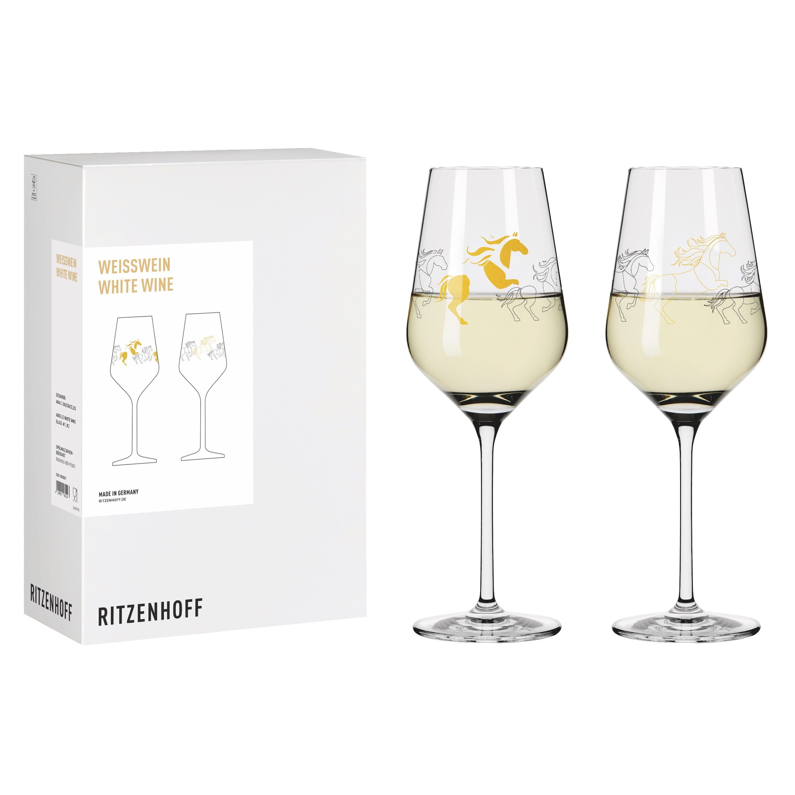 Genieße jeden Schluck Weißwein in Gläsern, die deine Leidenschaft für Pferde widerspiegeln. Dieses Weißweinglas-Set ist mit einer zarten Pferde-Lineart in goldenen und schwarzen Design verziert. Die kunstvolle Dekoration verleiht jedem Glas eine besondere Note und macht es zum idealen Begleiter für stilvolle Abende.