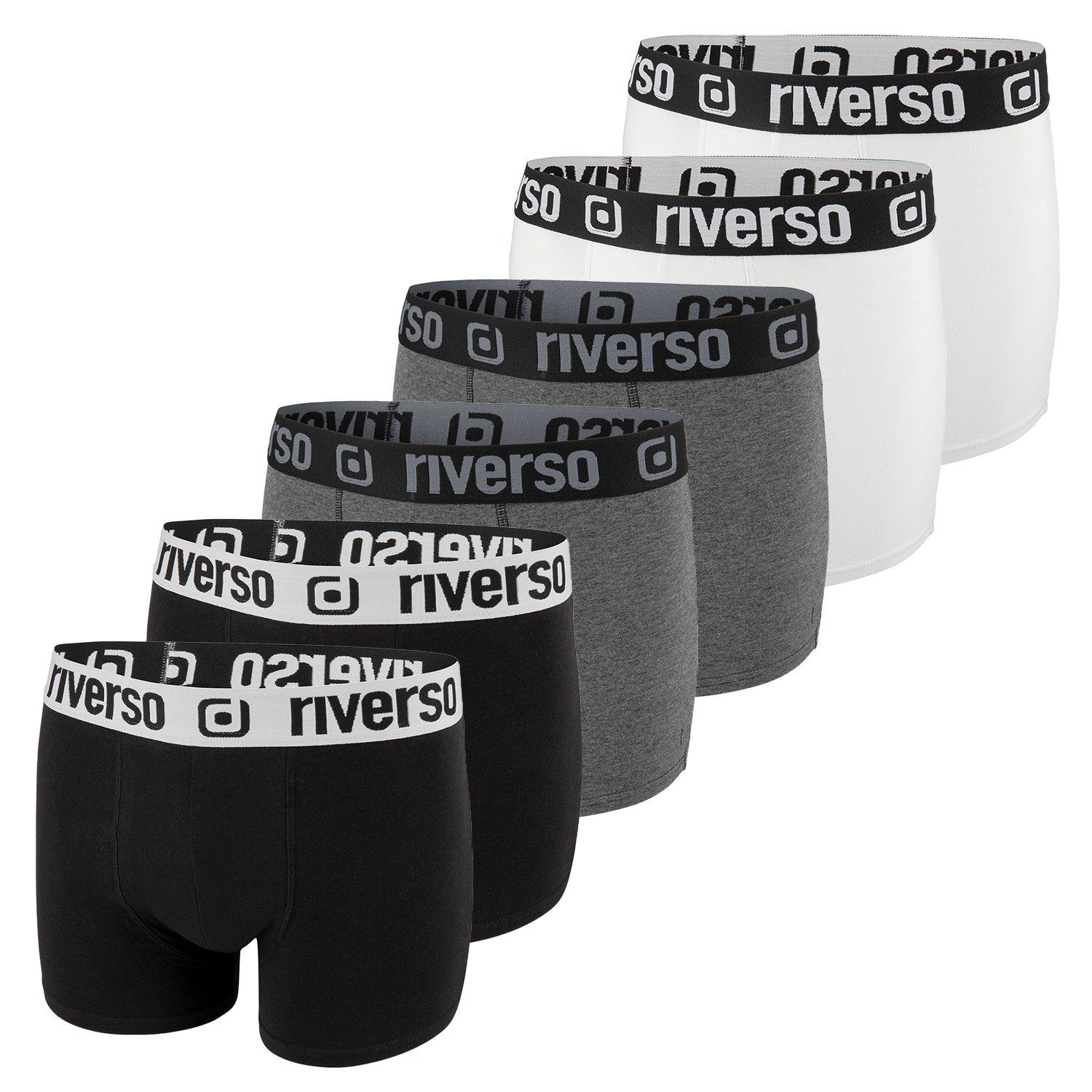 riverso Männer Basic Boxer RIVJonny 6er Pack mit einem angenehmen Tragegefühl durch den hohen Baumwollanteil. Der elastische Taillenbund sorgt für maximalen Tragekomfort und auch der Beinausschnitt ist so konzipiert, dass dieser in keiner Weise einschneidet. Es wurde bewusst auf störende Etiketten verzichtet, die Marken- und Pflegehinweise sind innenseitig eingeprägt. Als besonderer Eyecatcher dient der farbige Bund am Hosenbund und die farbigen Nähte.