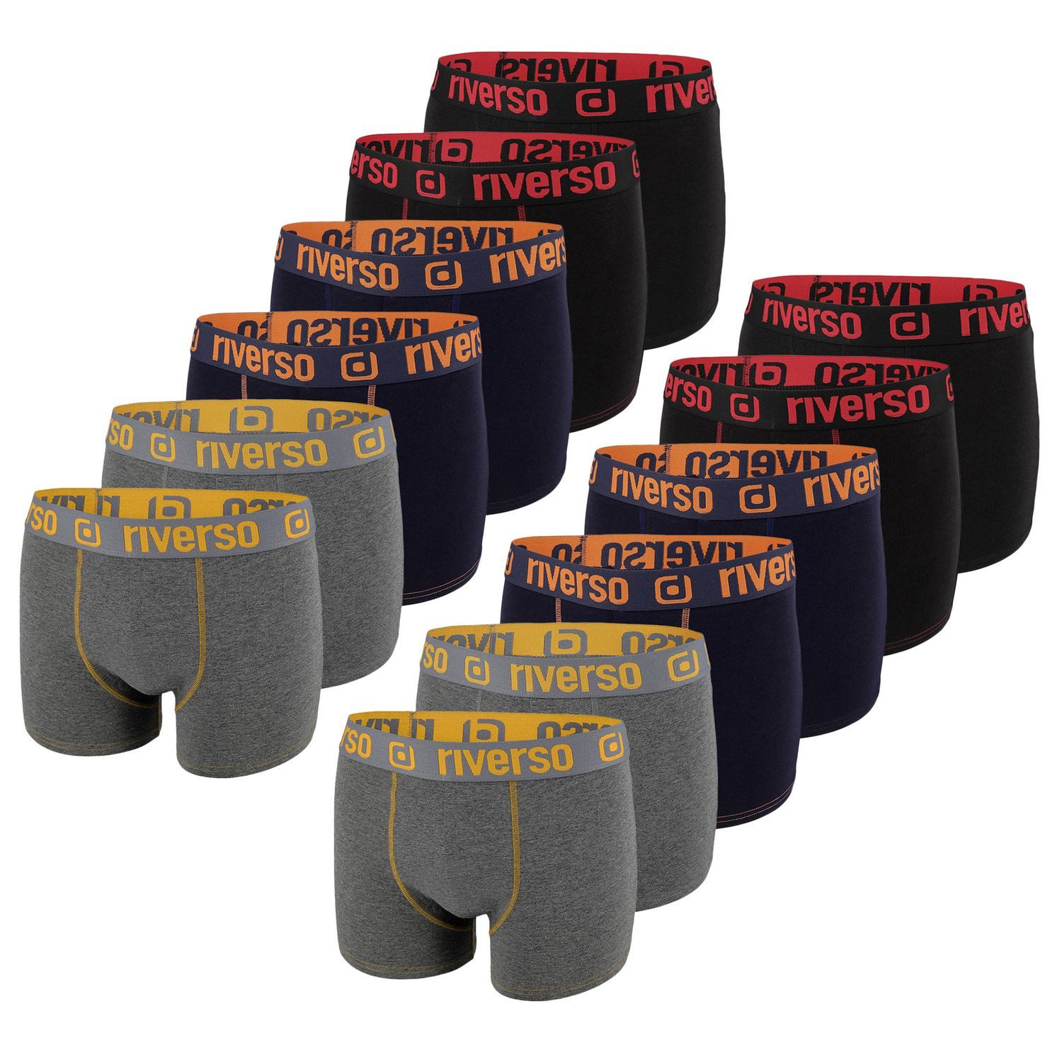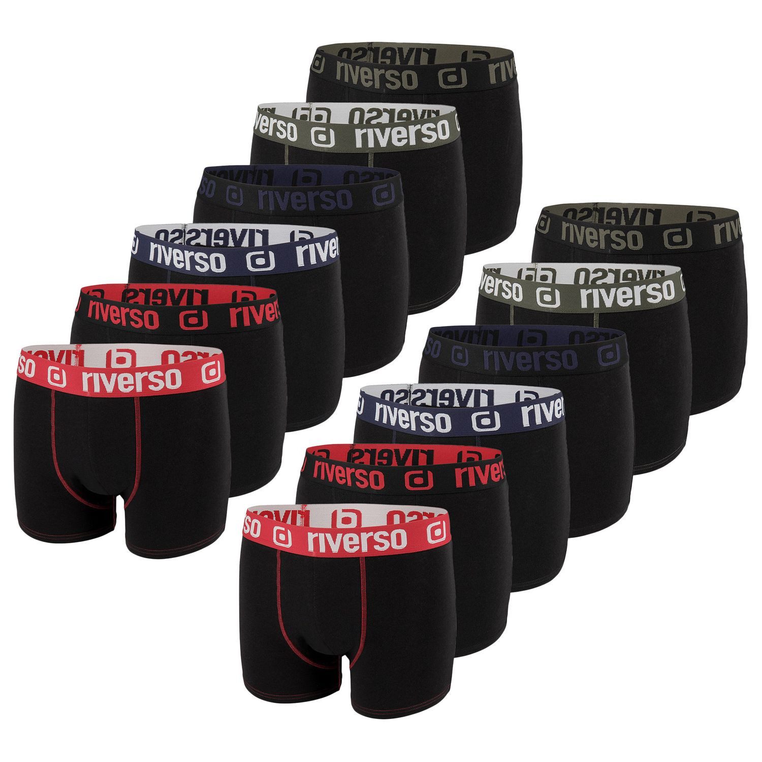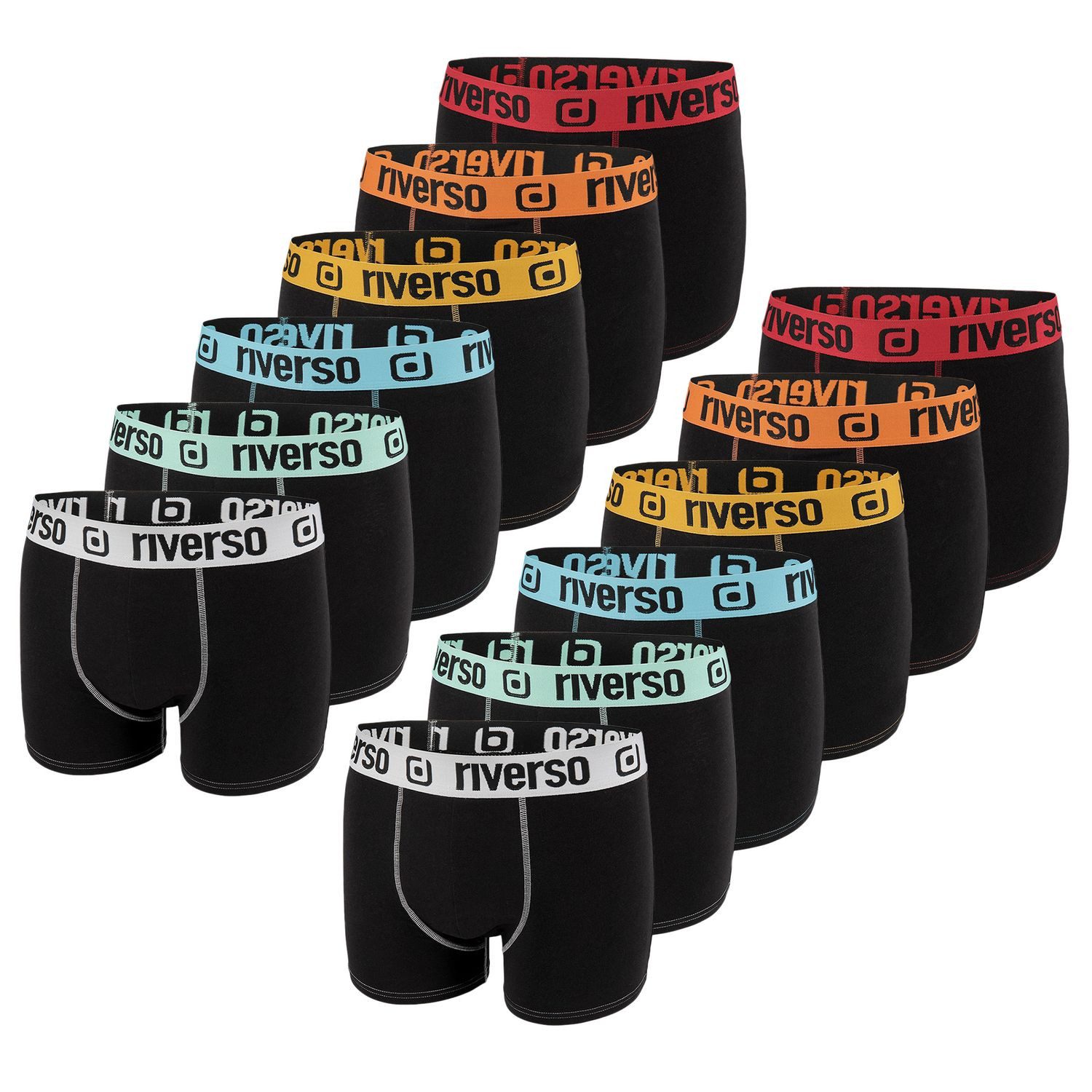riverso Männer Basic Boxer RIVOle 12er Pack mit einem angenehmen Tragegefühl durch den hohen Baumwollanteil. Der elastische Taillenbund sorgt für maximalen Tragekomfort und auch der Beinausschnitt ist so konzipiert, dass dieser in keiner Weise einschneidet. Es wurde bewusst auf störende Etiketten verzichtet, die Marken- und Pflegehinweise sind innenseitig eingeprägt. Als besonderer Eyecatcher dient der farbige Bund am Hosenbund und die farbigen Nähte.