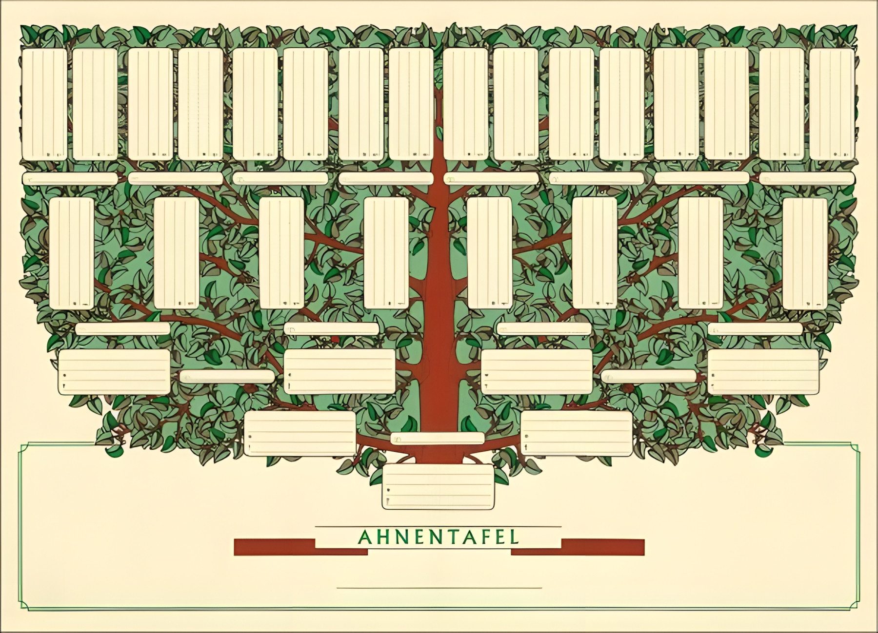 Ahnentafel. Für 5 Generationen. Auf Urkundenpapier. Im Taschenformat gefalzt. Einzeln in Sichthülle. Размер DIN A3/ DIN A5.