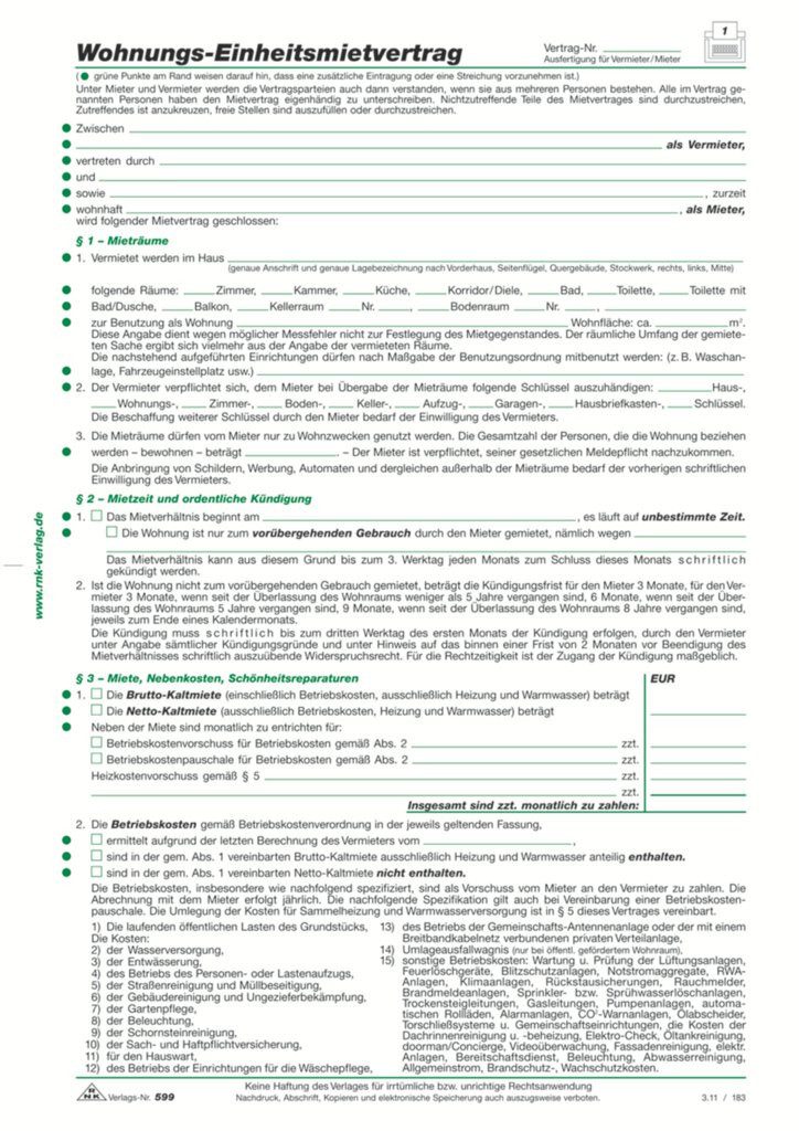 • RNK Mietvertrag Wohnung DIN A4 Einheitsmietvertrag 10St