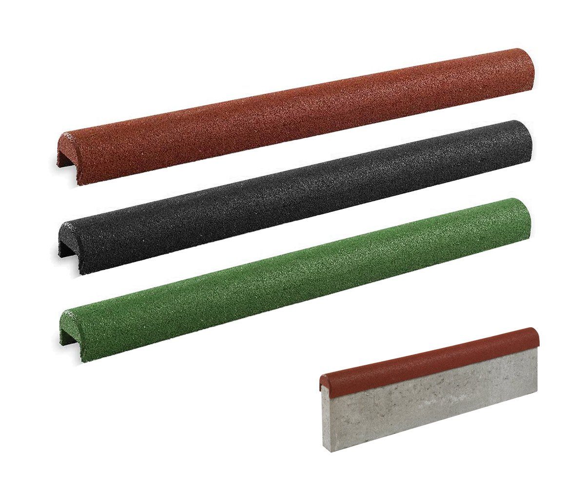 Bereits vorhandene oder neu eingebaute Beton-Randsteine können mit unserer elastischen Randsteinabdeckung, auch bekannt als Gummikappe oder Bordsteinkappe, nachträglich abgedeckt werden. Der Stoßdämpfende Schutzüberzug aus Gummigranulat minimiert das Risiko von Sturz- oder Aufprallverletzungen und bietet daher Fallschutz auf Spielplatz, im Kindergarten und auf öffentlichen Spiel-, Sport- und Freizeitflächen. Neben Randsteinen aus Beton können auch andere Bauelemente mit passender Breite wirkungsvoll abgesichert werden. Im Garten fasst der abgerundete Überzug den Übergang zwischen Terrasse und Beet oder Rasenfläche ein und bietet gleichzeitig einen weichen Übergang statt einer harten Kante. Auf Parkplätzen oder öffentlichen Wegen schont der Überzug für Wegeinfassungen Reifen und Felgen – sowohl von Autos als auch Fahrrädern.