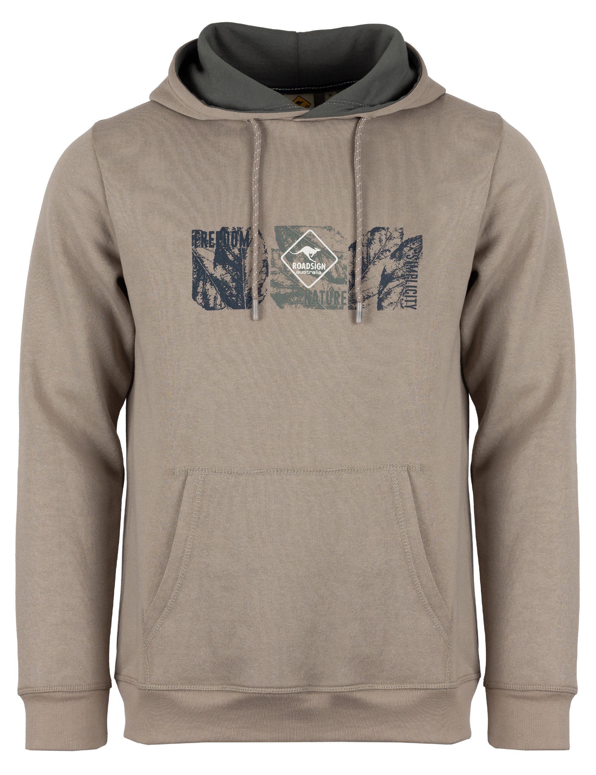 Kapuzen-Sweatshirt für Herren von ROADSIGN australia Der Desert Vibe Kapuzenpullover bringt Komfort und Stil in Einklang. Die weiche Innenseite sorgt für wohlige Wärme, während der klassische Schnitt mit Kapuze und Kängurutasche für Alltag und Freizeit ideal ist. Der auffällige Logo-Frontprint bringt markentypischen Charakter ins Spiel, ohne aufdringlich zu wirken. In einem warmen Beige-Ton gehalten, lässt sich dieser Hoody vielseitig kombinieren – egal ob zur Jogginghose oder lässigen Jeans. Perfekt für urbane Looks, entspannte Reisetage oder kühle Abende.