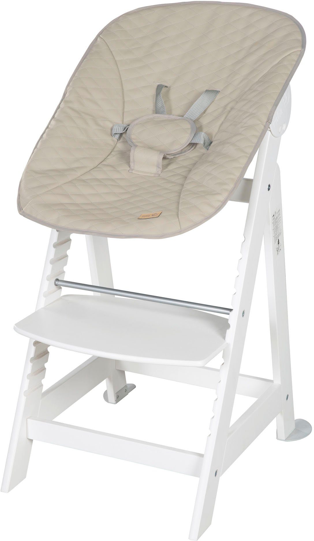 Der roba Treppenhochstuhl Born Up im modernen Design „Stone gesteppt“ wird in einem Komplett-Set mit Treppenhochstuhl und inkl. verstellbarem Aufsatz aus Kunstleder geliefert. Der Hochstuhl mit Aufsatz für Ihren Säugling ist von 0 bis 6 Monate und bis zu 9 kg geeignet. Ohne den Aufsatz ist der Stuhl der ideale Begleiter Ihres Kindes bis ins Jugendalter und bis zu max. 70 kg belastbar. Das 2in1 Set besteht aus einem mitwachsenden, Treppenhochstuhl aus Holz und einem verstellbaren Aufsatz, in dem Ihr Baby bequem und sicher liegt. Der Aufsatz lässt sich per Knopfdruck in eine Schlaf- und eine Fütterposition verstellen. Der Hochstuhl mit 3-Punkt-Gurtsystem bietet Ihrem Kind bis ins Jugendalter ergonomischen, sicheren und angepassten Sitzkomfort. Der Babyhochstuhl mit Liegefunktion mit 5-Punkt-Gurtsystem bietet ab der Geburt eine lange Nutzungs- und Lebensdauer. Für Kleinkinder ist die oberste Ebene des Born Up Hochstuhls vorgesehen. Nach einfacher Abnahme von Schutzbügel und Gurtsystem wächst der Treppenhochstuhl stufenweise - unterstützt durch das höhenvariable und herausnehmbare Sitz- bzw. Fußbrett - zum Jugendstuhl heran. Das Produkt ist mit einem Aufsatz aus pflegeleichtem und hochwertigem Kunstleder ausgestattet. Der Stuhl überzeugt durch die zeitgemäße Optik, die sich in jedes Wohn- und Babyzimmer integriert und die weiche Haptik des Aufsatzes. Der Hochstuhl mit 3-Punkt-Gurtsystem wurde nach der aktuellen Norm DIN EN 14988:2017 in Deutschland entwickelt. Der Aufsatz mit 5-Punkt-Gurtsystem wurde kippsicher nach der aktuellen Norm EN 12790:2009 in Deutschland entwickelt. Hochstuhl (ohne Aufsatz): LxBxH: 54 x 44,50 x 80 cm. Sitzhöhe max. 55 cm, min. 42 cm.