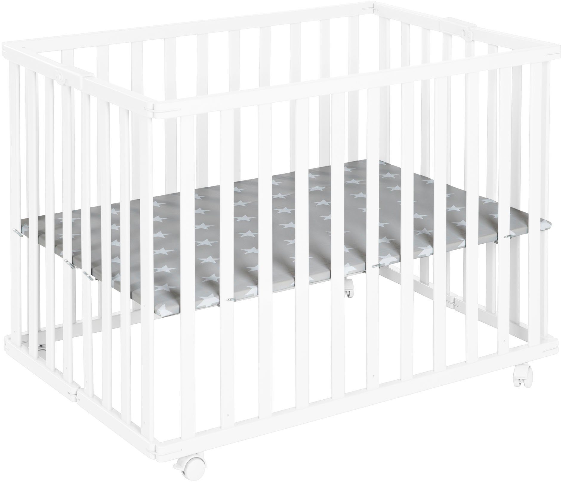 Design & Komfort: Stabiles, klappbares Laufgitter aus Holz in Weiß mit 74x100 cm großer, gepolsterter Spielfläche, 2-fach höhenverstellbar für rückenschonendes Spielen