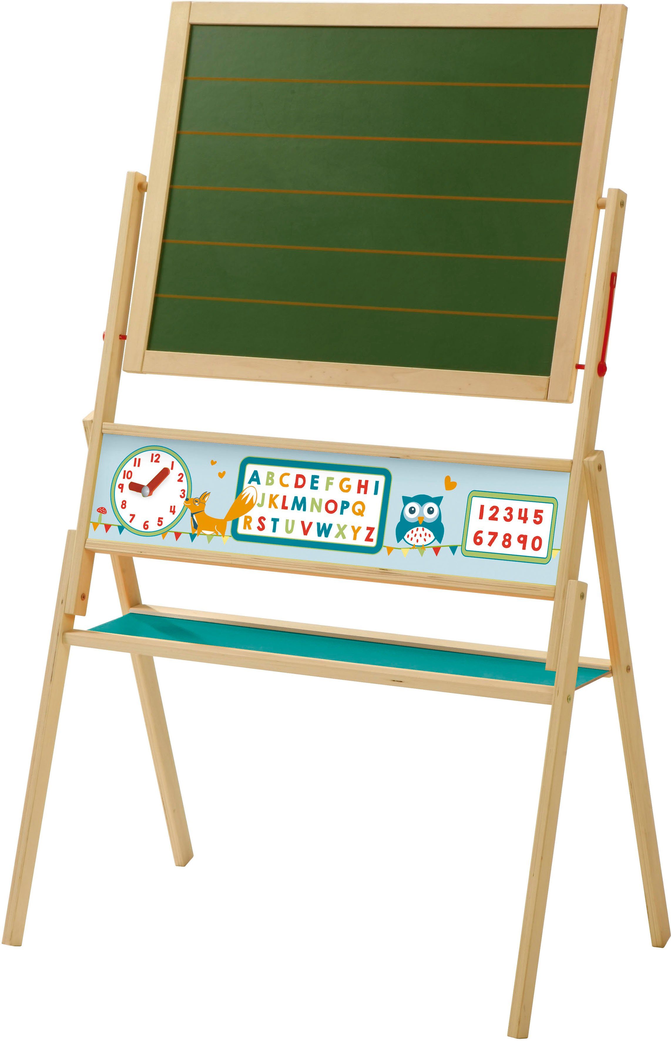 Ausstattung | Ablagefach, Aufgedrucktes ABC, Tafelseiten magnetisch und liniert, Uhr mit beweglichen Zeiger |