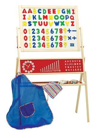 Ausstattung | Ablagefach, Aufgedrucktes ABC, Tafelseiten magnetisch und liniert, Uhr mit beweglichen Zeiger, Zählwerk |
