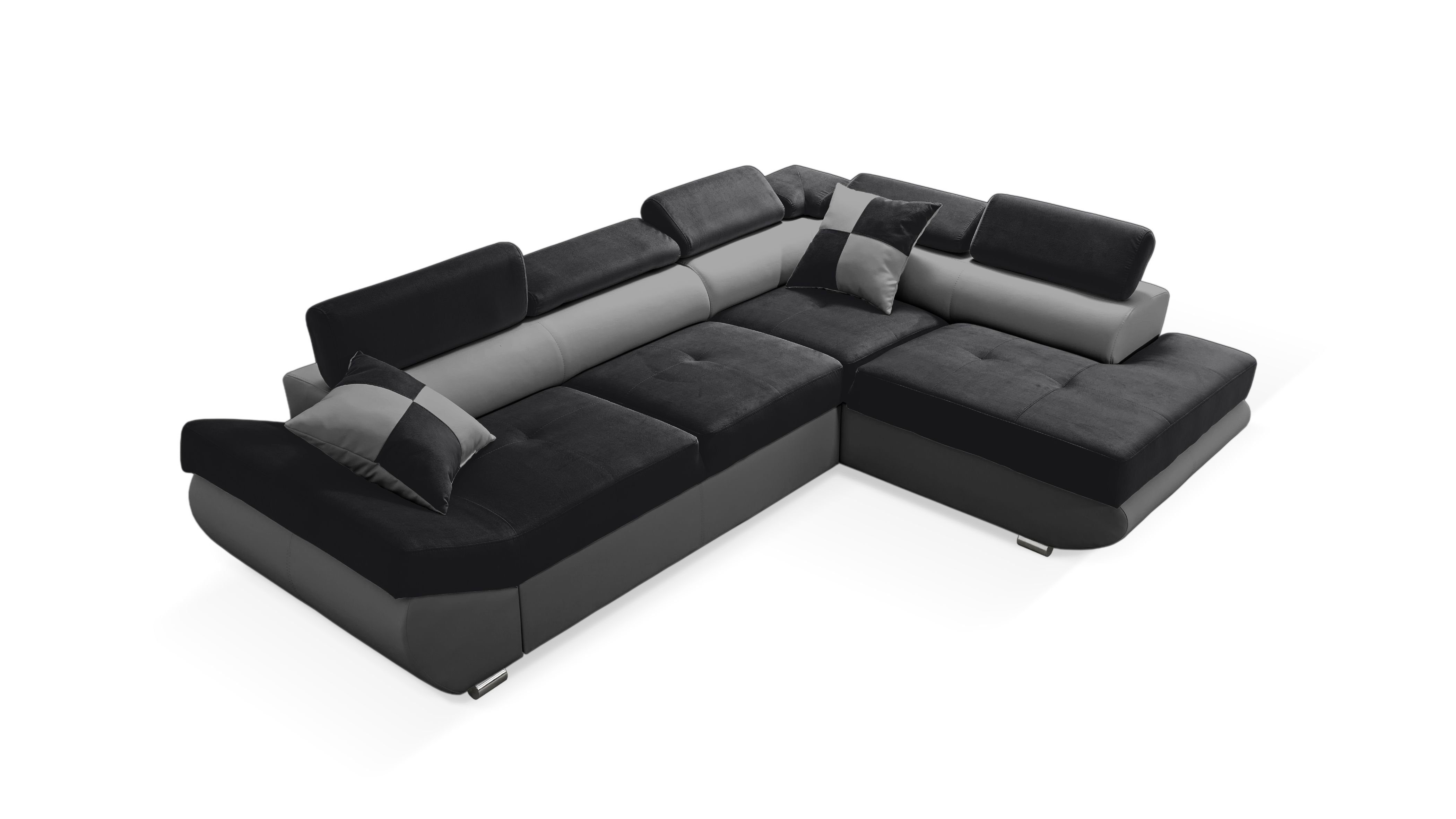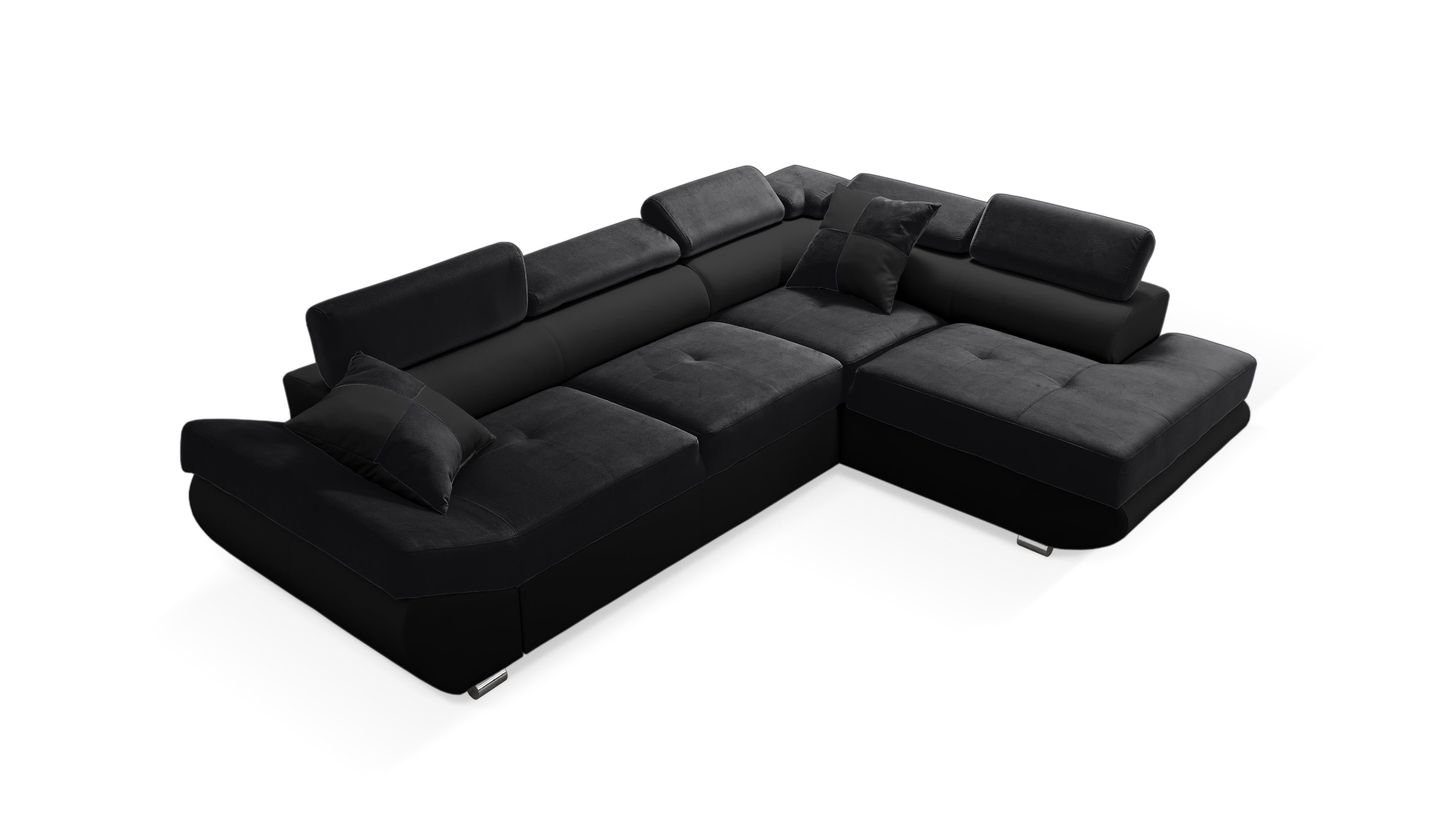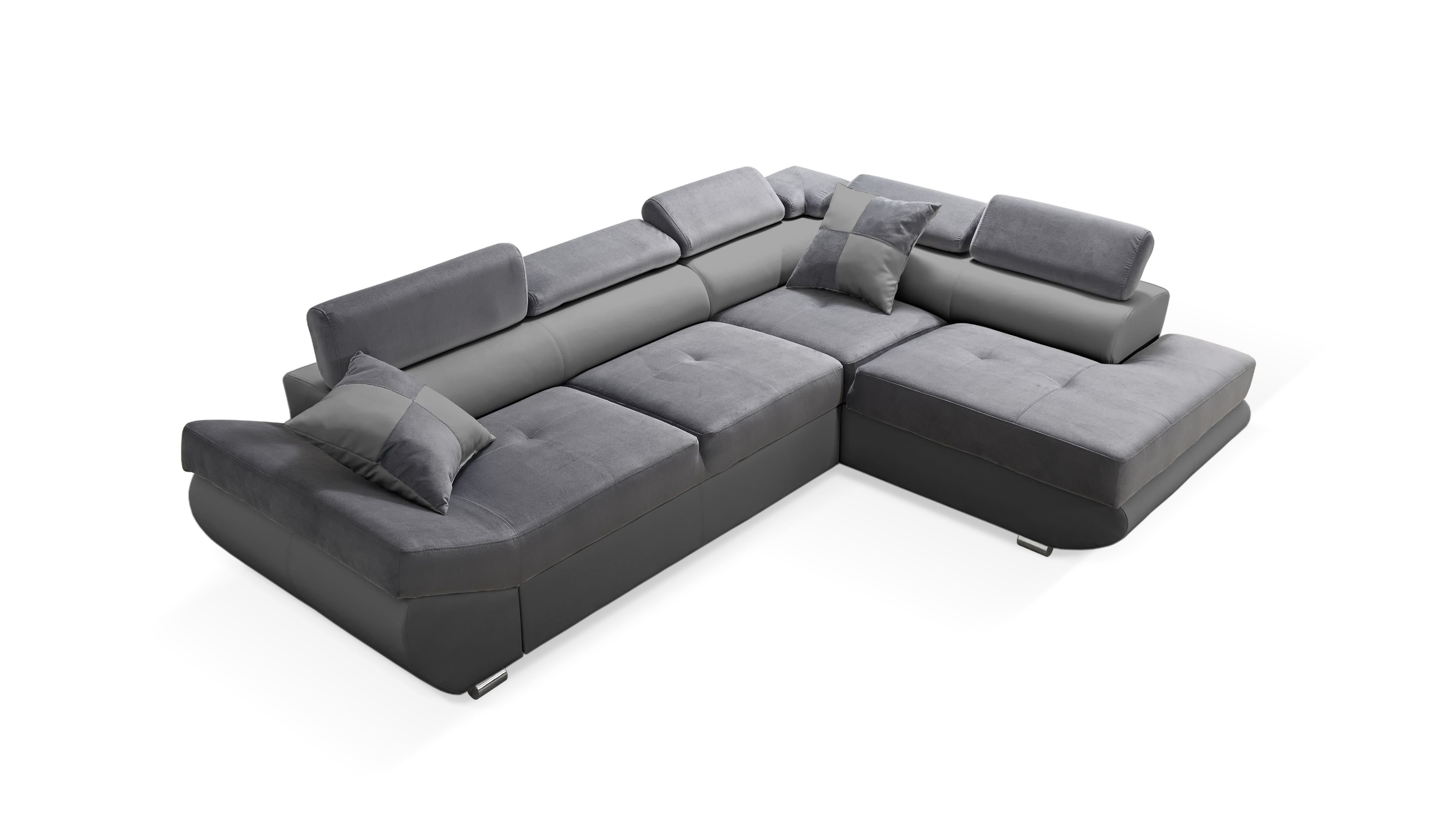 Das Robin Saturn Ecksofa mit Schlaffunktion, Bettkasten, 5 verstellbaren Kopfstützen und 2 Kissen bietet reichlich Platz für Familien oder Gäste. Dank der L-Form kann der Raum optimal ausgenutzt werden, indem das Sofa in eine Ecke platziert oder in der Zimmermitte aufgestellt wird. Die Schlaffunktion ermöglicht es, das Sofa einfach in ein bequemes Bett zu verwandeln, ideal für Übernachtungsgäste. Mit Wellenfeder, hochelastischem Schaum und verstellbaren Kopfstützen bietet es hohen Komfort. Das stilvolle Design passt zu jedem Wohnstil, und die Herstellung in der EU garantiert Qualität und Эко-товары.
